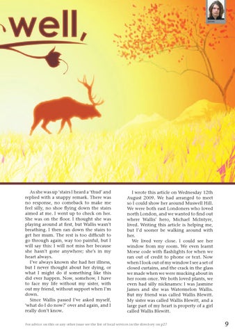 I wrote this article on Wednesday 12th August 2009. We had arranged to meet so I could show her around Muswell Hill. We were both east Londoners who loved north London, and we wanted to find out where Wallis’ hero, Michael McIntyre, lived. Writing this article is helping me, but I’d sooner be walking around with her. We lived very close. I could see her window from my room. We even learnt Morse code with flashlights for when we ran out of credit to phone or text. Now when I look out of my window I see a set of closed curtains, and the crack in the glass we made when we were mucking about in her room once. We both loved plants, we even had silly nicknames: I was Jasmine James and she was Watermelon Wallis. But my friend was called Wallis Blewitt. My sister was called Wallis Blewitt, and a large part of my heart is property of a girl called Wallis Blewitt.