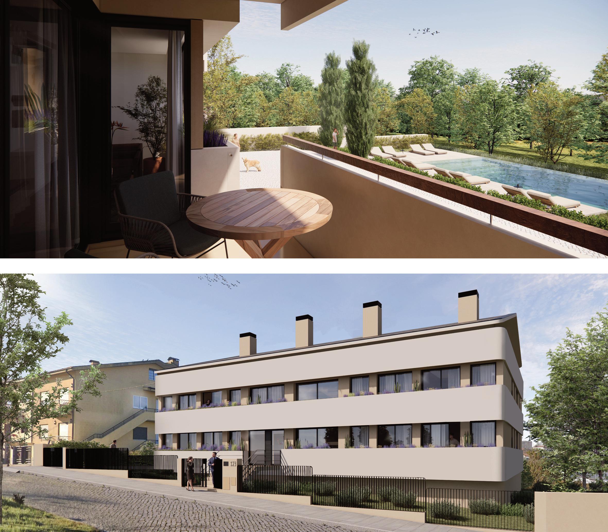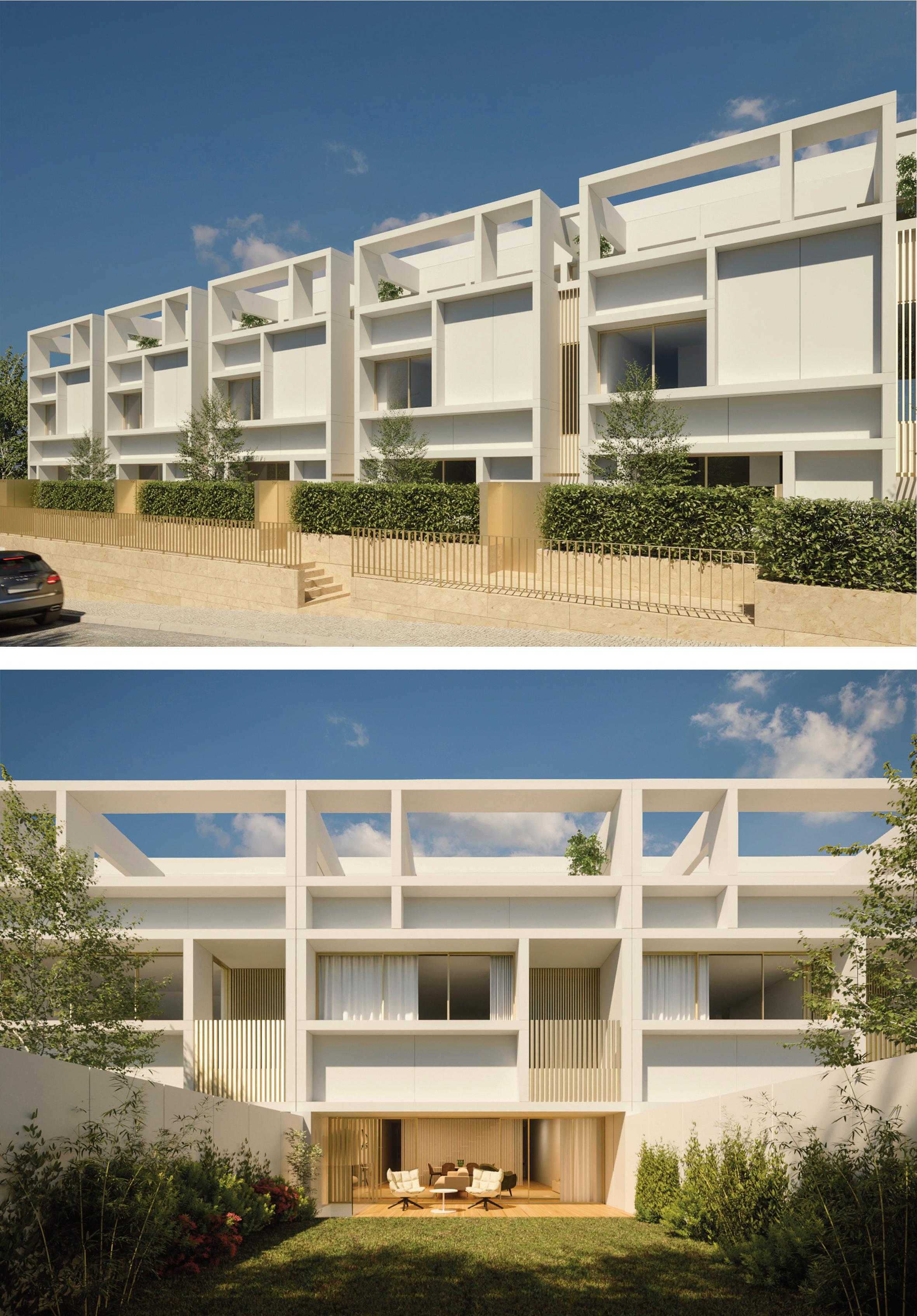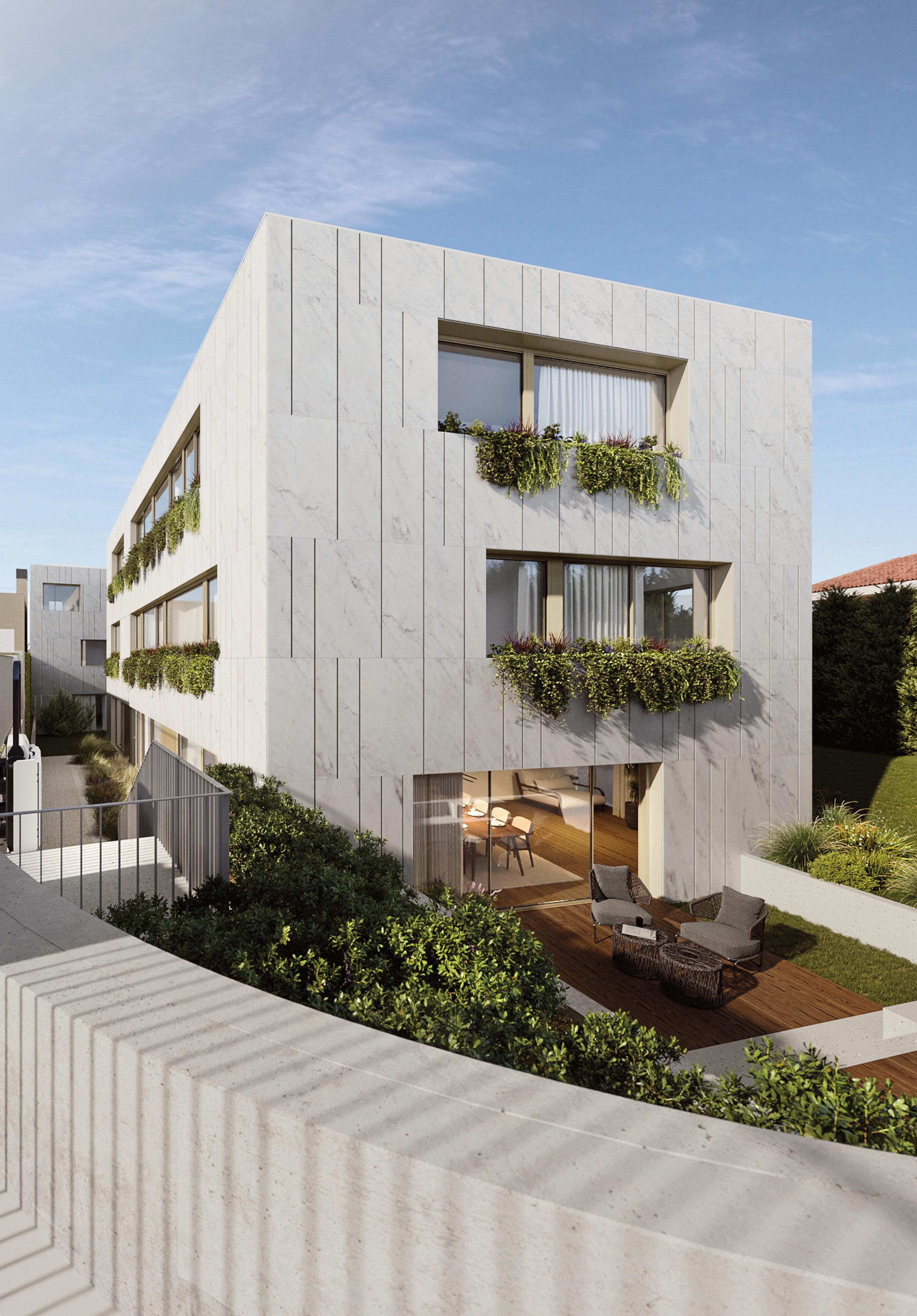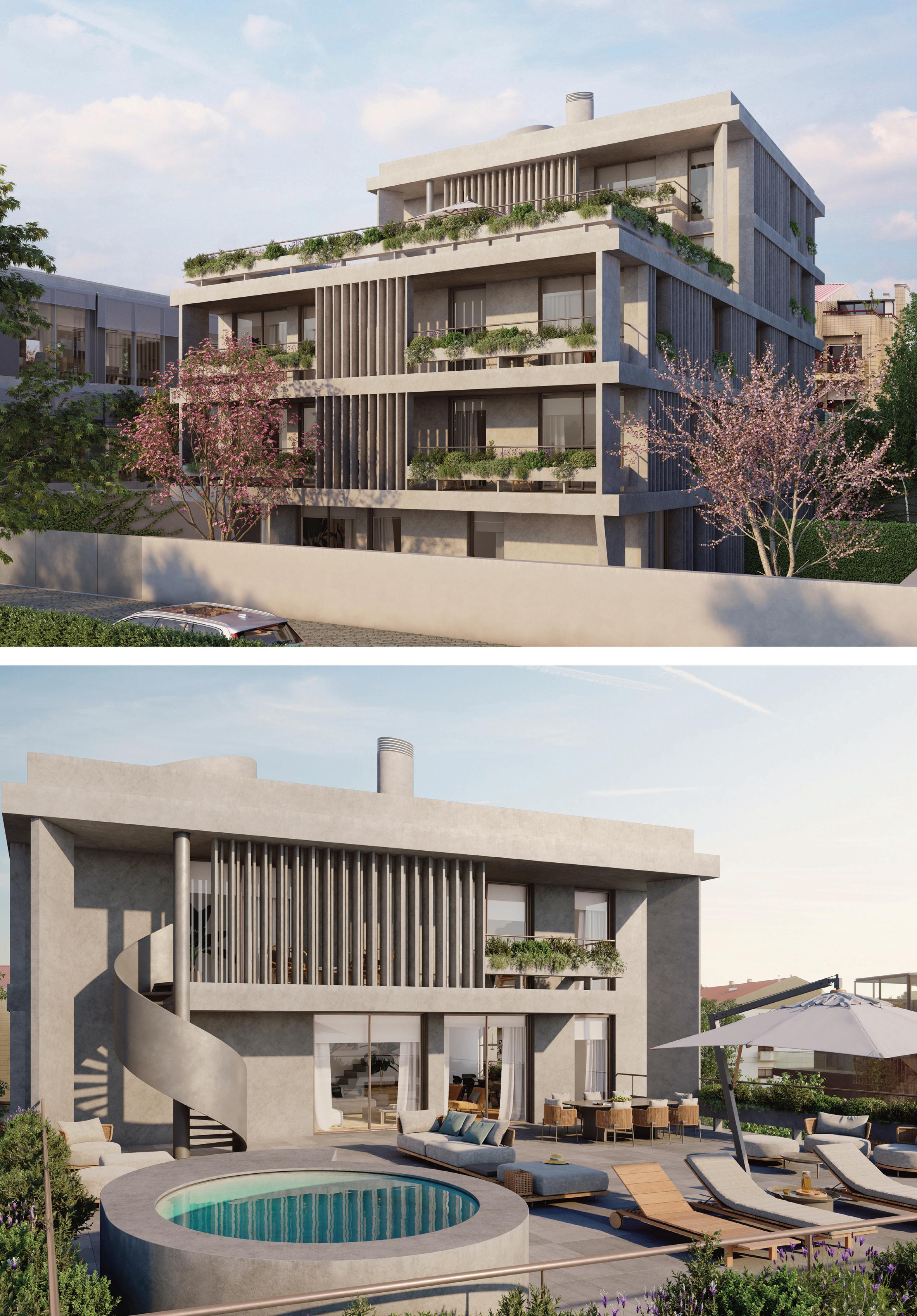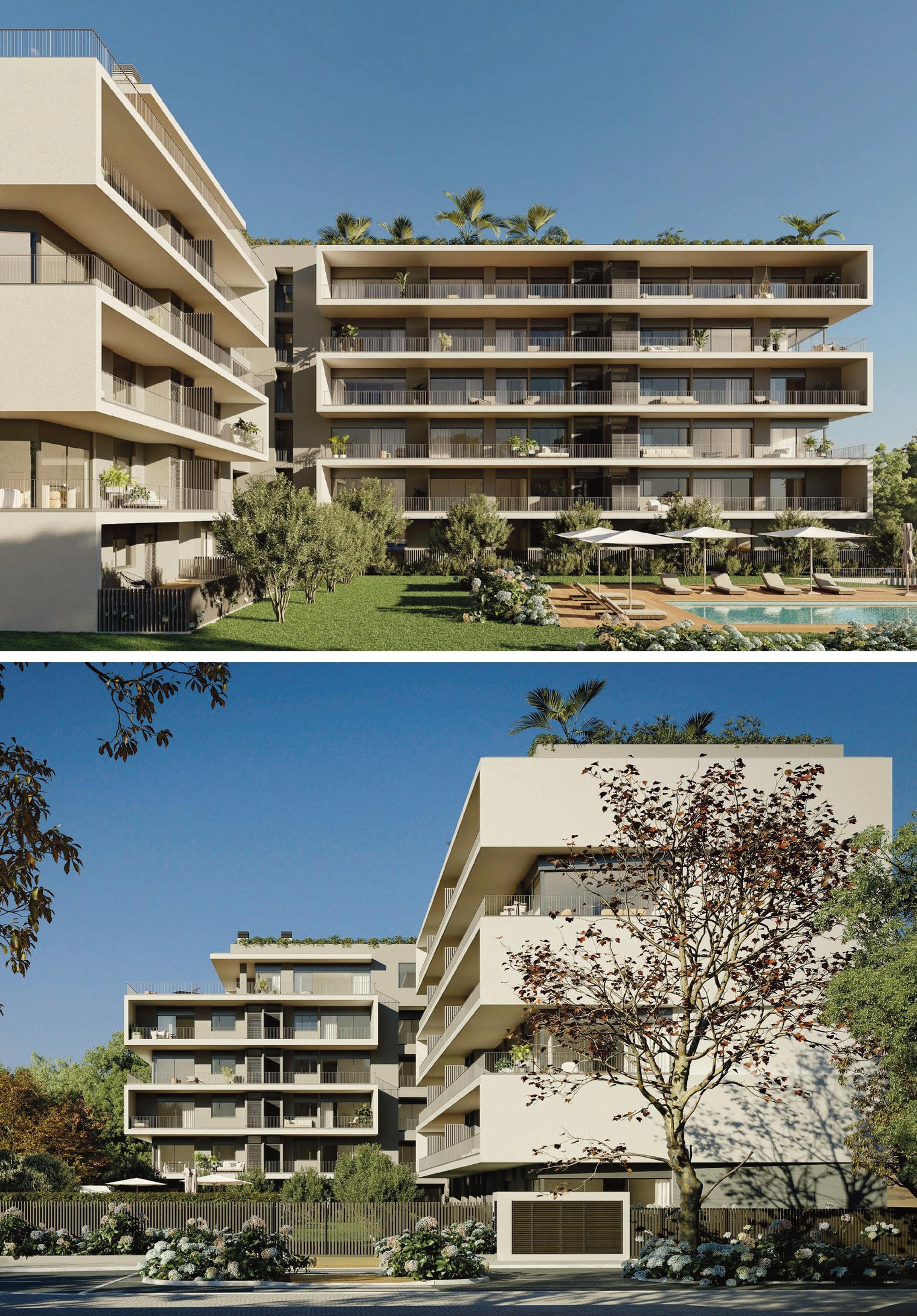 Composto por dois edifícios de design arquitetônico distinto, o projeto oferece 9 apartamentos de alto padrão, com acabamentos de excelência e espaços amplos, destacando-se pelas salas com varandas orientadas a poente e jardins exclusivos.