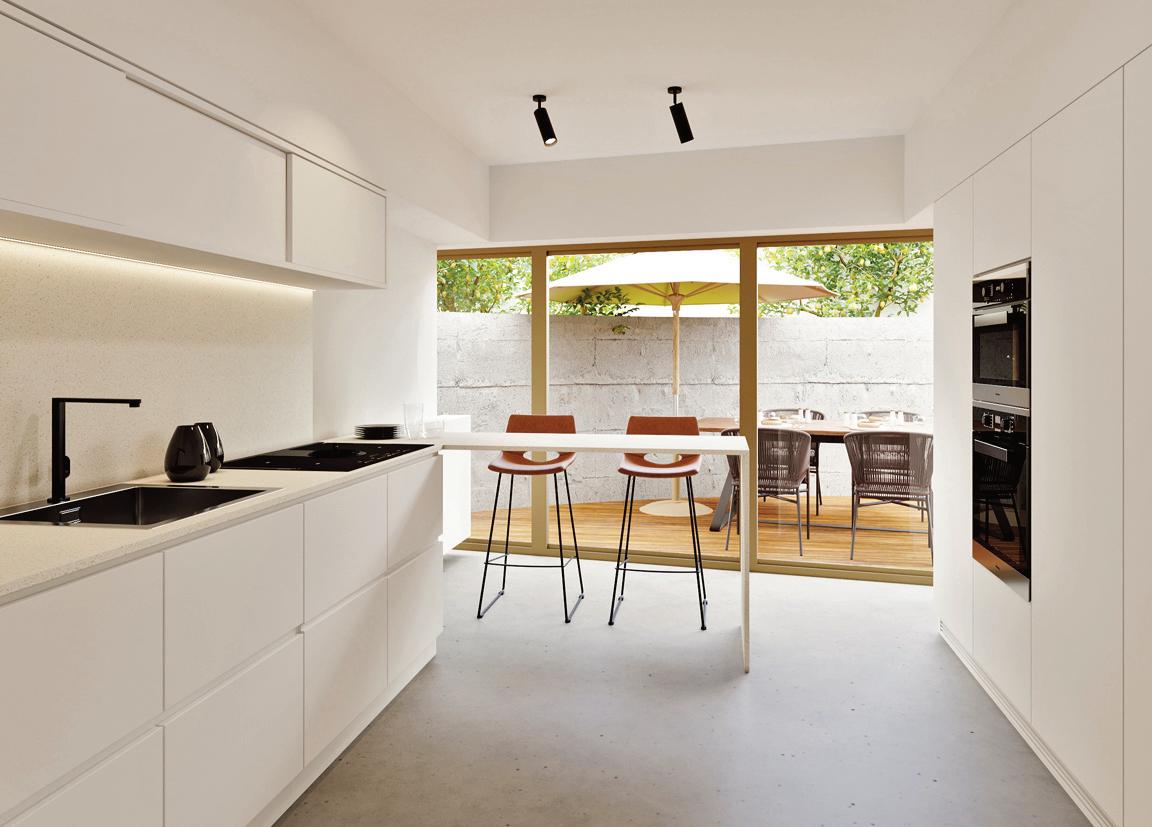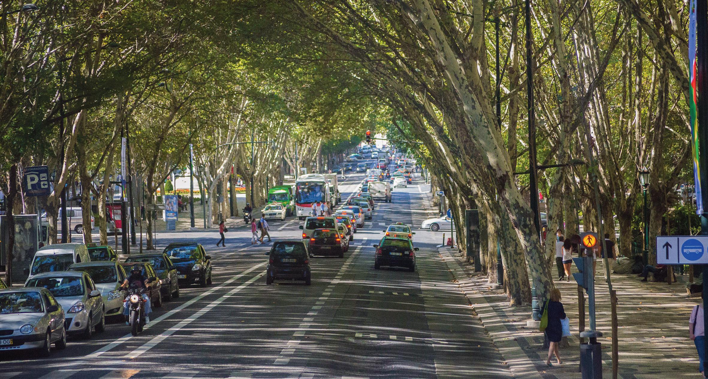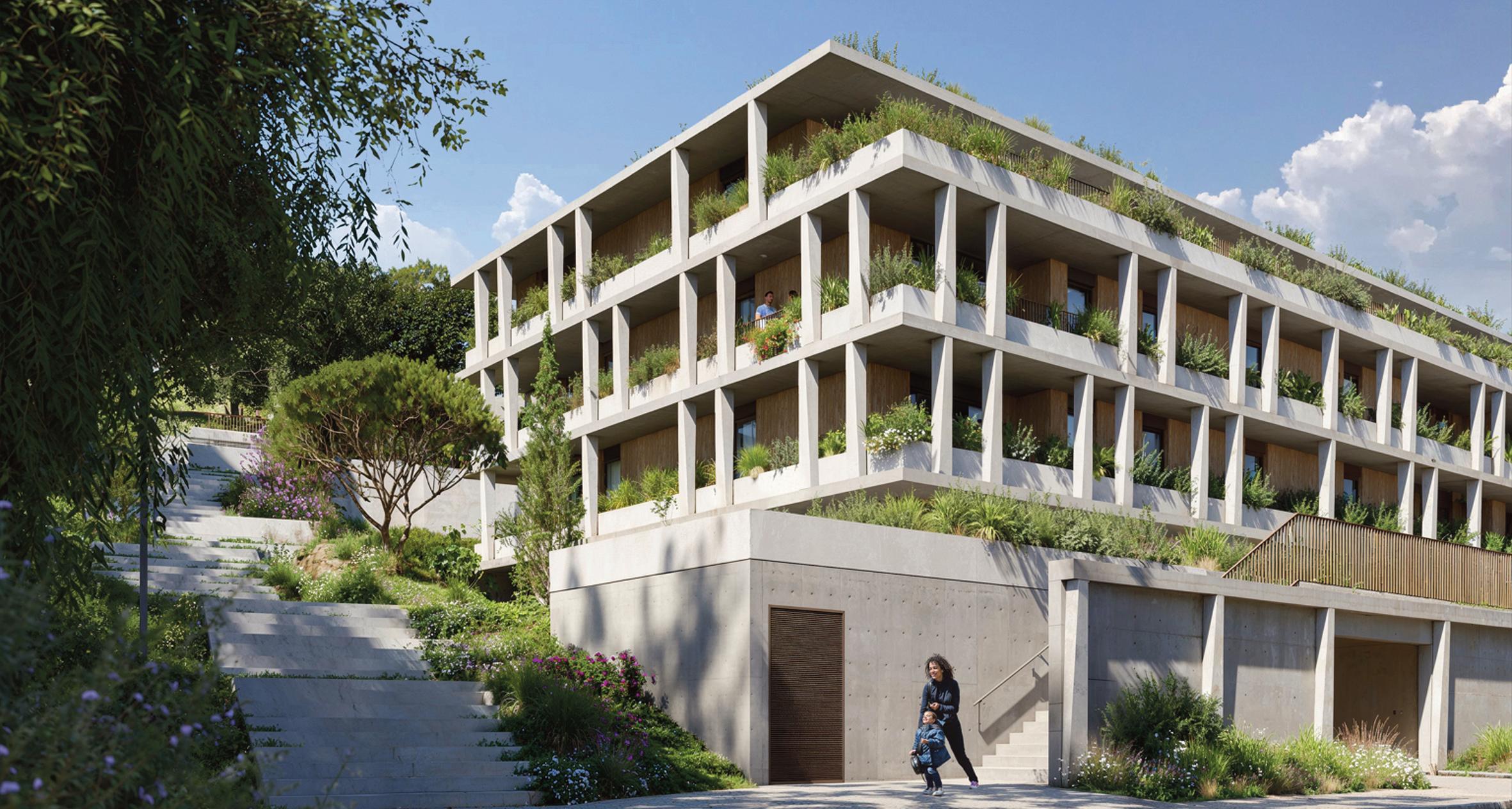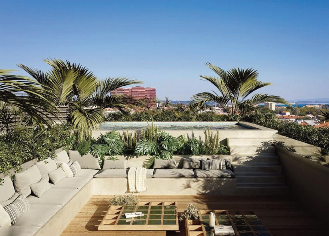 A materialidade refl ete a arquitetura lisboeta: mármore lioz bujardado, microbetão de alta resistência, caixilhos bronzeados e vegetação abundante.