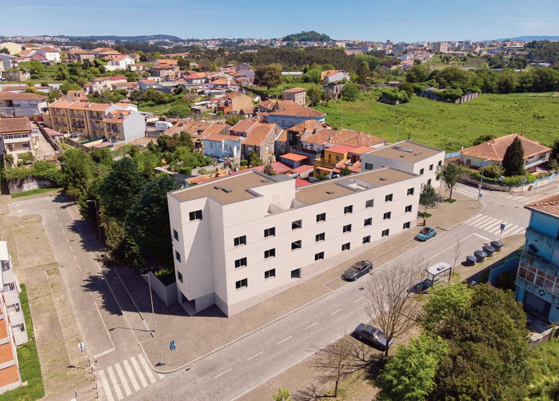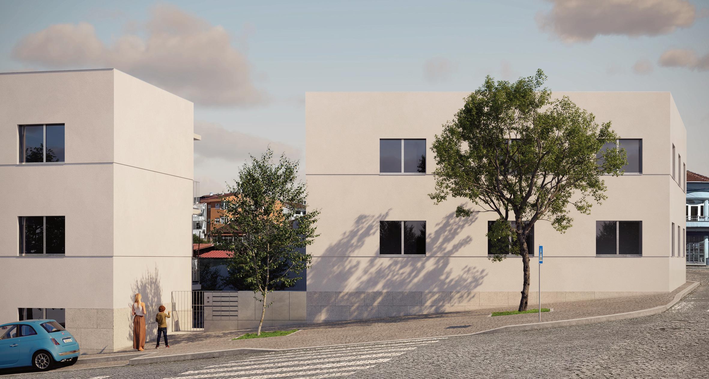 O projeto integra três edifícios interligados, com 18 apartamentos de tipologias T0 a T2, e cave comum com estacionamento.