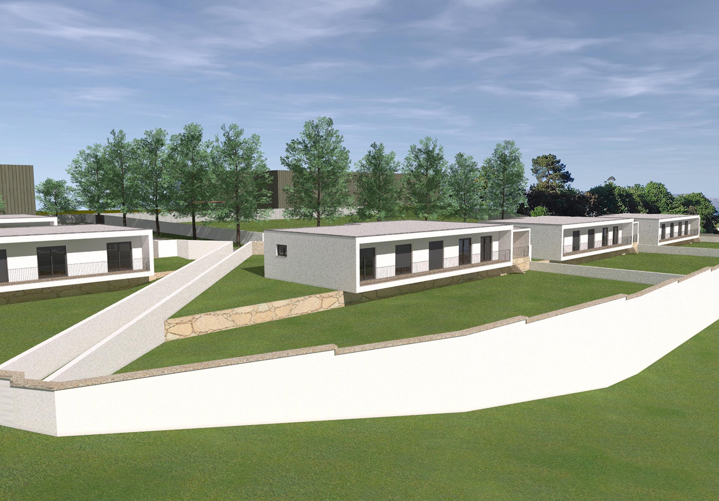 por 3 pisos. Moradias V3, c/ uma suite, jardim e piscina privativos