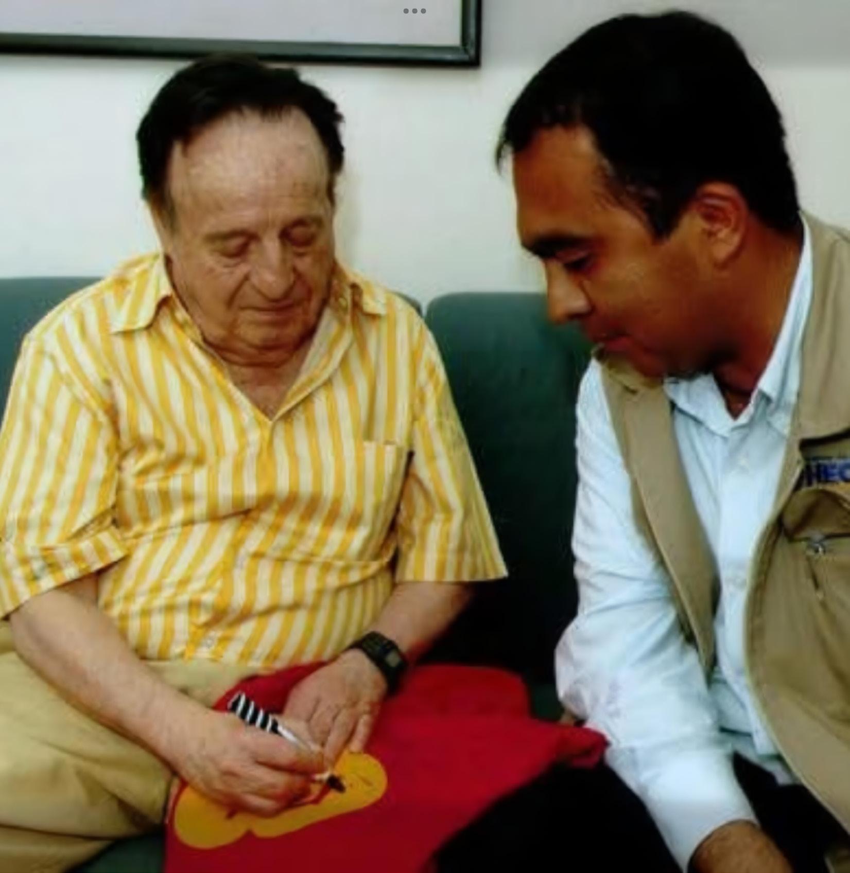 Famosos periodistas potosinos como Francisco Javier Rosales Hernández, mejor conocido como “Junior”, quien fungía entonces como director de Información en gobierno del estado, platicó largamente con el genial creador de personajes icónicos como El Chavo del 8, el doctor Chapatin y el Chómpiras. Inclusó le autografió la clásica camiseta roja del Chapulín Colorado. Aquí ambos en la foto.