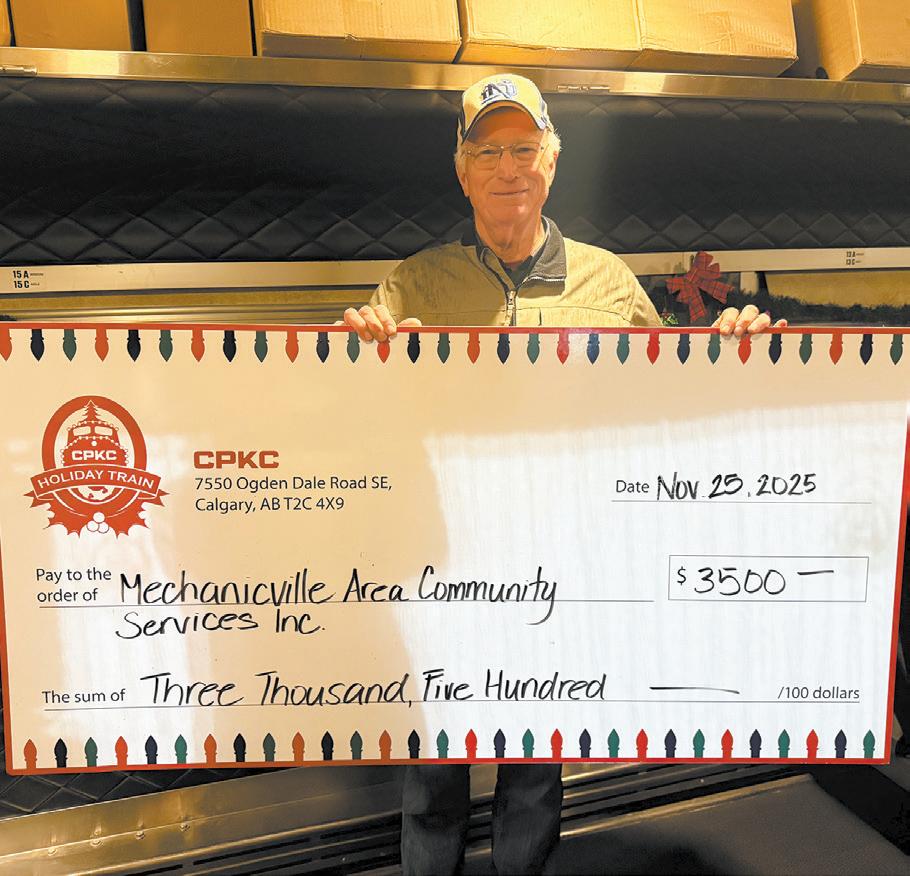At least a thousand people braved the rain on a cold night to greet the Canadian Pacific Holiday Train. People gathered in the Elks parking lot and across the train tracks to welcome the Holiday Train. The Canadian Pacific came bearing gifts. A check of $3500 was donated to The Mechanicville Area Community Services Center. People were gathered on each side of the railroad tracks by the Elks, to listen to holiday music before the train had to continue its journey.