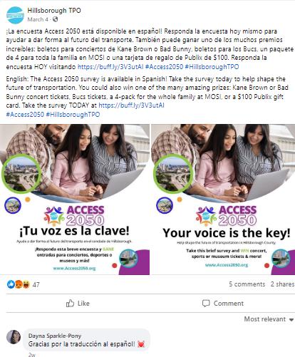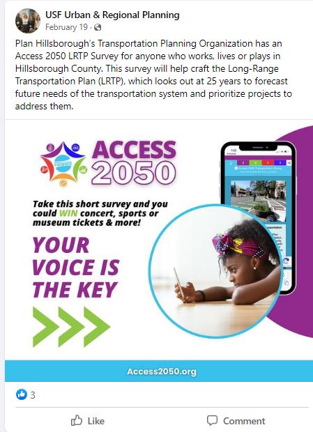 The Hillsborough Transportation Planning Organization (Hillsborough TPO) worked diligently to develop and execute an impactful public engagement strategy to ensure that residents were able to complete the Long Range Transportation Plan (LRTP) survey to provide their input about the future of transportation in Hillsborough County, Florida. As the agency that serves the transportation planning needs across Hillsborough County, Florida, the Hillsborough TPO is mandated by federal and state law and focuses on policymaking and funding allocation. The Hillsborough TPO is directly responsible for ensuring federal and state money is spent on transportation projects and programs that are based on an ongoing, cooperative, and comprehensive planning and public outreach process. Through meaningful public engagement, the Hillsborough TPO establishes priorities for short- and long-term multimodal transportation needs across Hillsborough County, including the cities of Tampa, Temple Terrace, and Plant City. 1