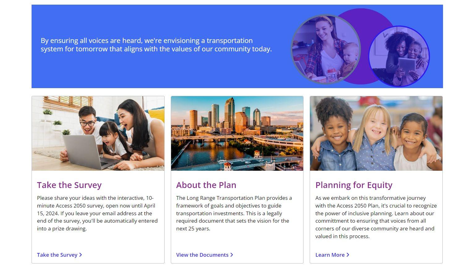 The Hillsborough TPO is committed to using meaningful public engagement to establish priorities for short- and long-term multimodal transportation needs for Tampa, Temple Terrace, Plant City, and unincorporated Hillsborough County. Effective public participation is essential to the successful implementation of Access 2050, and necessary to ensure that the needs of Hillsborough County’s many unique and diverse communities are adequately addressed. The feedback and ideas provided through all public engagement opportunities will directly help to inform the decisions made throughout the next phase of the Long Range Transportation Plan process.