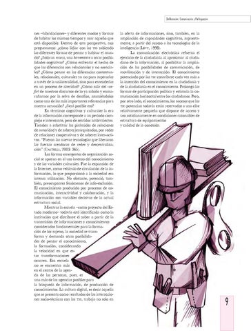 nes –hibridaciones– y diferentes modos y formas de habitar los mismos tiempos y usar aquello que está disponible. Dentro de esta perspectiva, nos preguntamos: ¿cómo lidiar con las tic sabiendo las diferentes formas de pensar y habitar el mundo? ¿Solo un recurso, una herramienta u otras posibilidades cognitivas? ¿Cómo enfrentar el hecho de que las diferencias son relacionales y no esenciales? ¿Cómo pensar en las diferencias contextuales, relacionales, culturales ya no para superarlas a través de la unilateralidad, sino para entenderlas en un proceso de alteridad? ¿Cómo salir del confort de nuestros discursos de lo ya sabido y enmarañarnos por la selva de desafíos, asumiéndolos como una de las más importantes referencias para nuestra actuación? ¿Será posible eso? En términos cognitivos y culturales la era de la información corresponde a un período complejo e interesante, pero de sentidos ambivalentes. Tienden a substituir las pirámides de relaciones de autoridad y de saberes jerarquizados, por redes de relaciones cooperativas y de saberes inter-activos. “Fueron las nuevas tecnologías que liberaron las fuerzas creadoras de redes y descentralización” (Castells, 2003: 365). Las formas emergentes de organización social se apoyan en el uso intenso del conocimiento y de las variables culturales. Fue la expansión de la Internet, como vehículo de circulación de la información, lo que proporcionó a la sociedad esa intensa utilización. No obstante, potenció, también, preocupantes fenómenos de info-exclusión. El conocimiento producido por procesos de comunicación, interactividad y colaboración, y la información son variables decisivas de la actual estructura social. Mientras la escuela –como proyecto del Estado moderno– todavía está identificada como la institución que distribuye el saber a partir de la transmisión de informaciones y conocimientos considerados fundamentales para la formación de los sujetos, la sociedad se transforma y demanda otras posibilidades de pensar el conocimiento, la formación, considerando la velocidad en que estas transformaciones ocurren. Esa escuela no se encuentra más en el centro de la agenda de las personas, pues, es una más de las agencias posibles para la búsqueda de información, de producción de conocimientos. La cultura digital, es decir aquella que se presenta como resultados de las interacciones socio-técnicas con las tic, trabaja no solo en