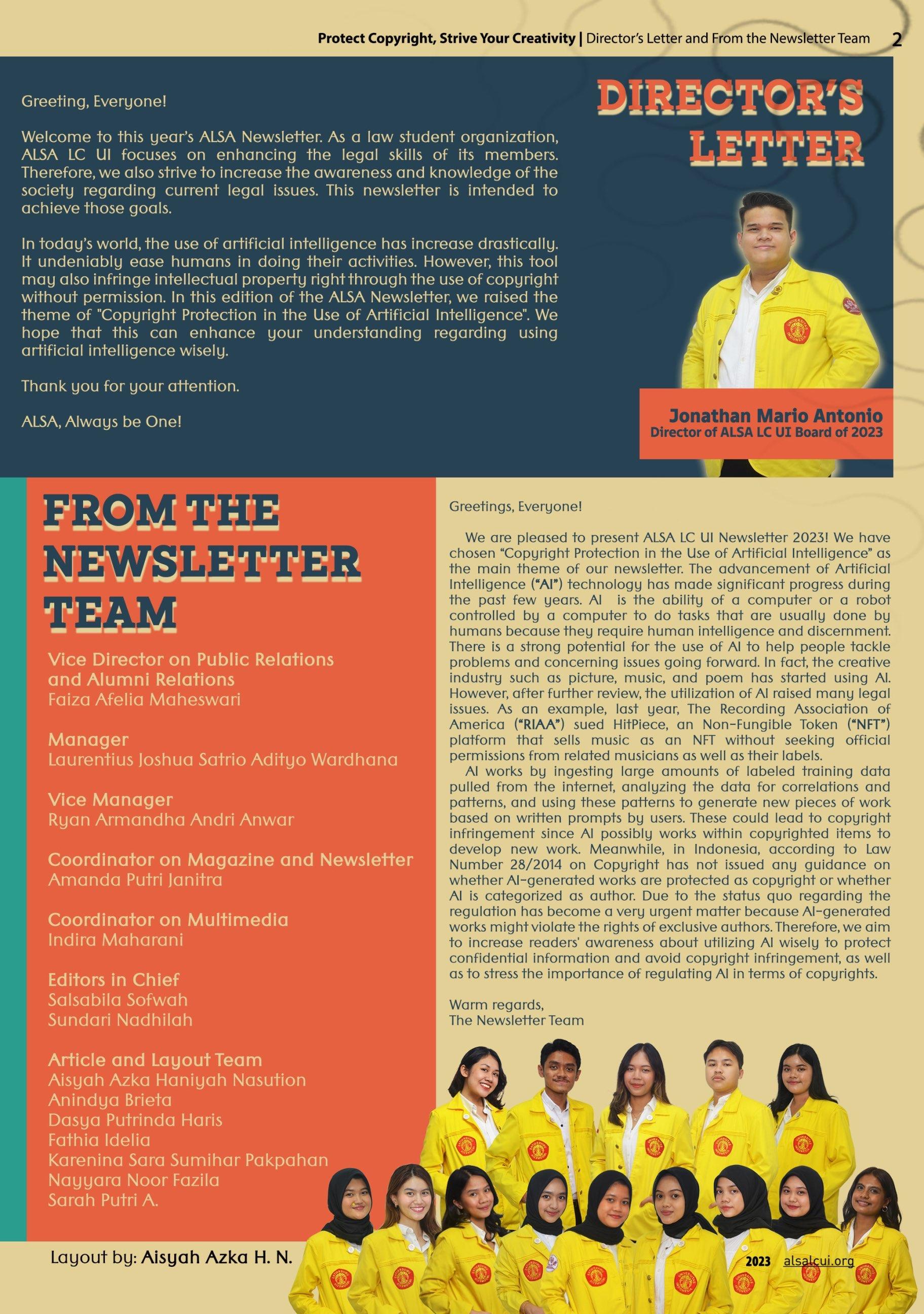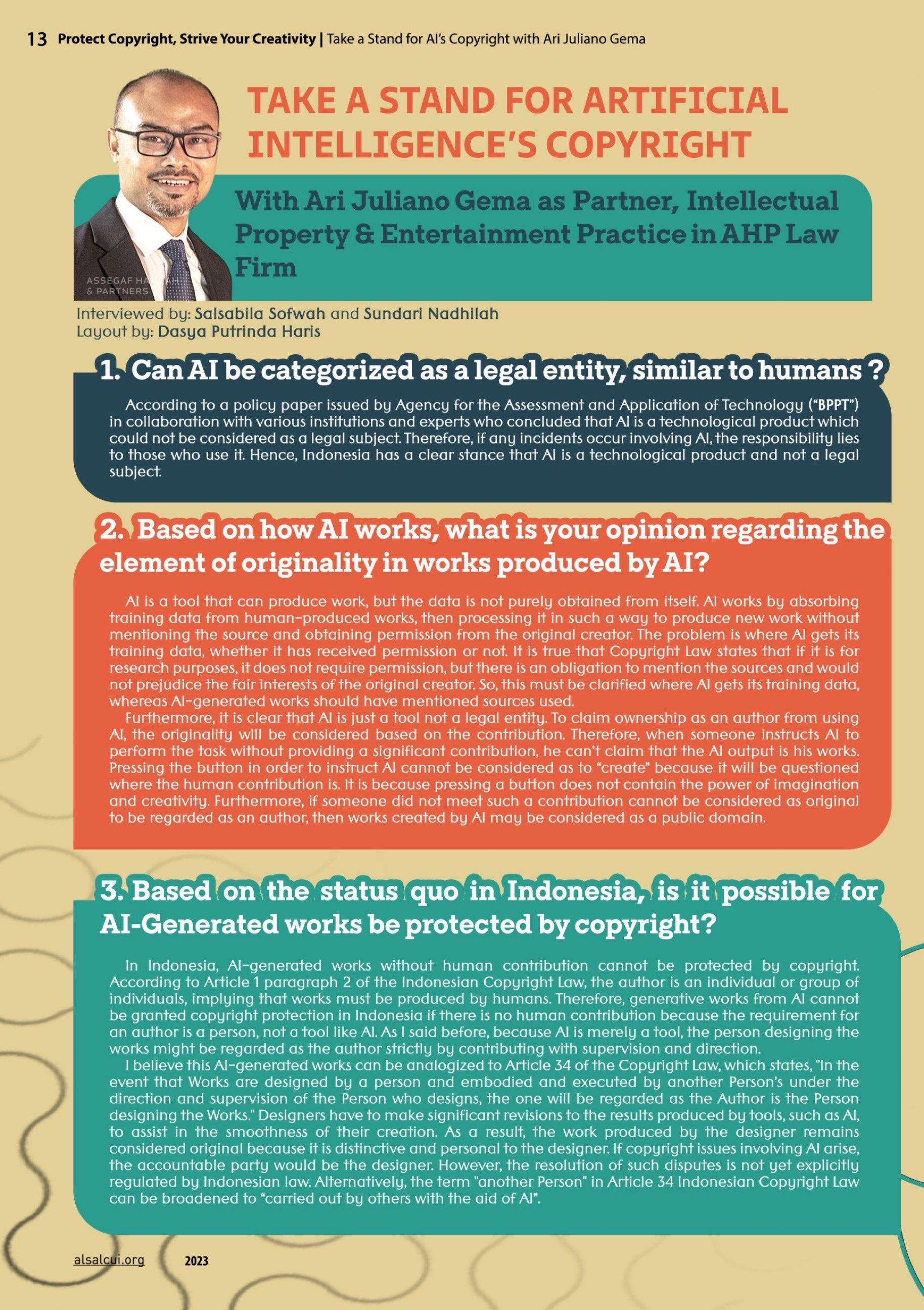 ALSA LC UI Newsletter 2023 features an interview with Ari Juliano, a Partner in Intellectual Property & Entertainment Practice at Assegaf Hamzah & Partners, as well as the selected news article from the Open Submission written by Davina Adinda and Jody Nicholas.