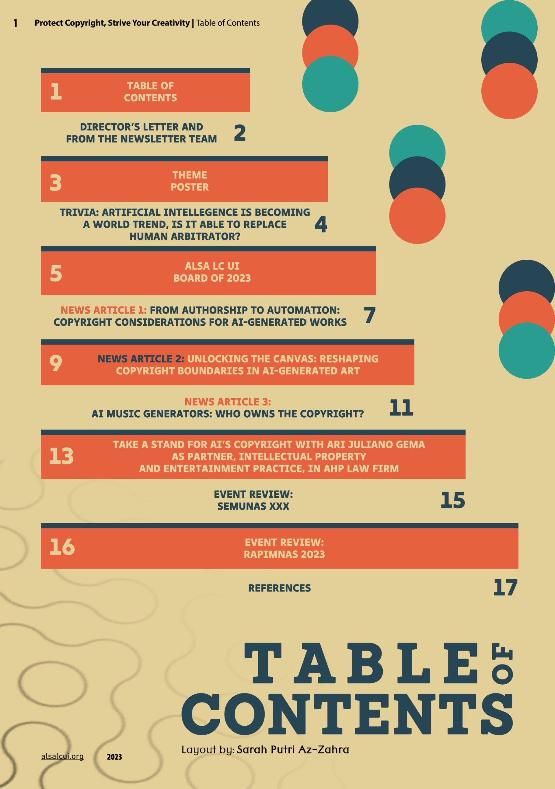 External Public Relations of ALSA LC UI Board of 2023 brought the theme of “Copyright Protection in the Use of Artificial Intelligence”. Artificial Intelligence (“AI”) has created a massive impact as soon as people realize the benefits it provides and how does it affect people’s life in multidimensional ways. However, after further reviews, using AI has raised legal problems in copyright protection because of its ability to produce works by absorbing data without mentioning the source and obtaining permission from the original author.