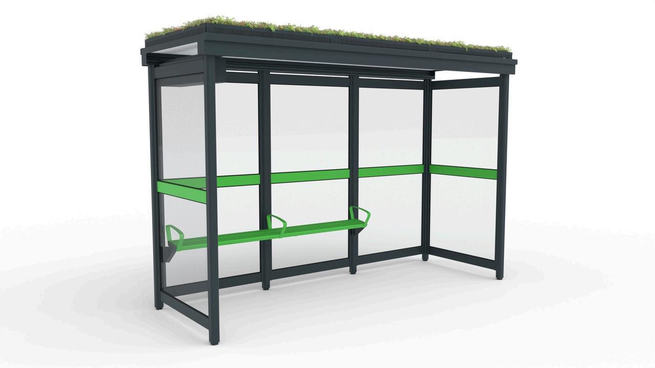 4-Bay with green living Hub roof, individual seats with wireless charging tables and integrated poster case