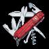 Swiss pocket knife with the following functions: large blade, small blade, corkscrew, can opener with small screwdriver, bottle opener with large screwdriver, wire stripper reamer, punch, sewing eye, keyring, tweezers, toothpick, scissors, hook, wood saw.