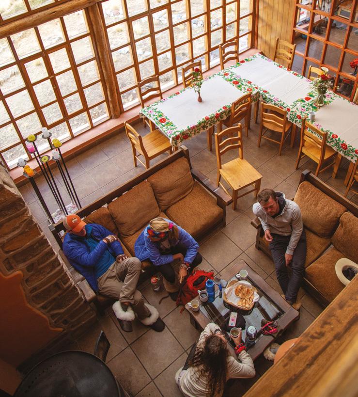 The food is also a journey through Quechua culture as the guides prepare meals with locally-sourced ingredients in an authentic way, just as they would for celebrations at home. The teas are foraged and can often help if trekkers suffer from altitude sickness. Early morning alarms are made more bearable as Quechua ladies sing their traditional songs throughout the lodge, awakening trekkers for fresh coffee and breakfast before gearing up for the day of hiking ahead. Each lodge is heated with a wood-burning fireplace that is the