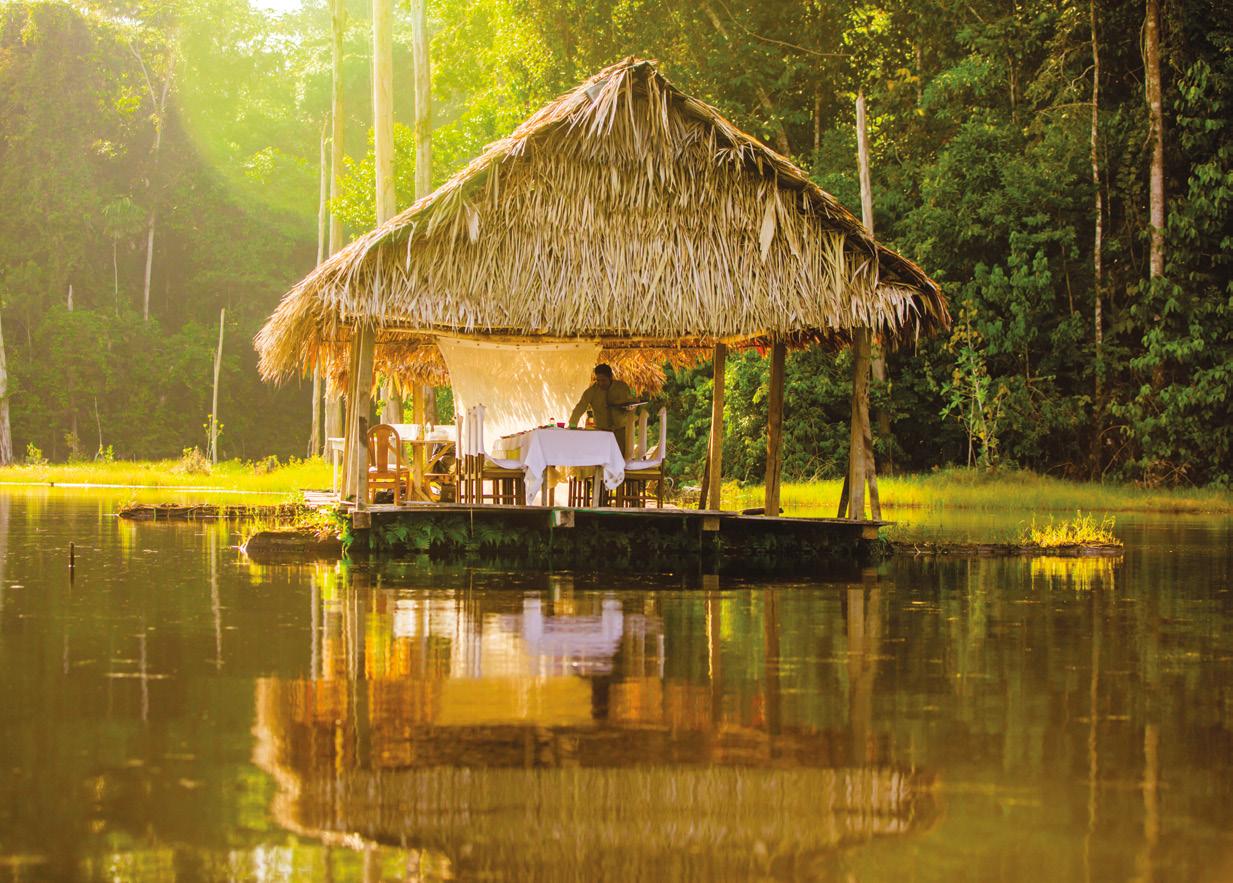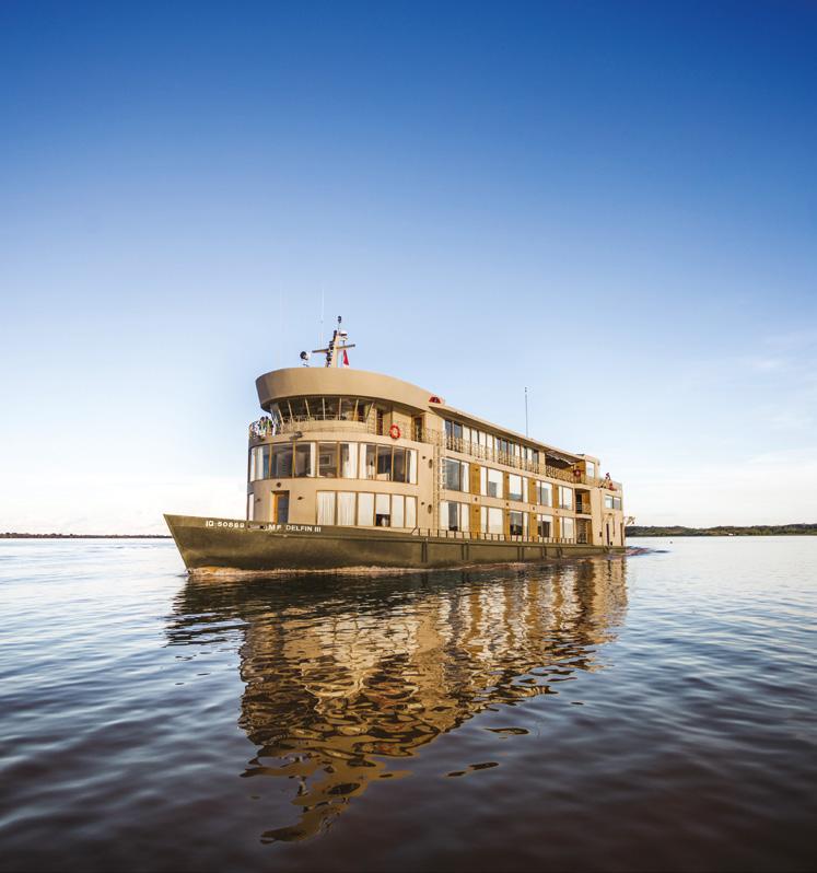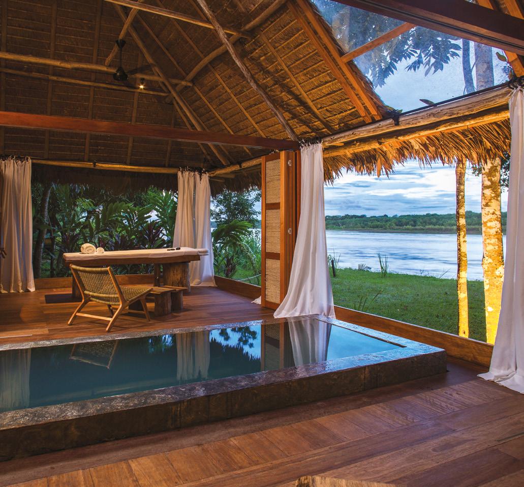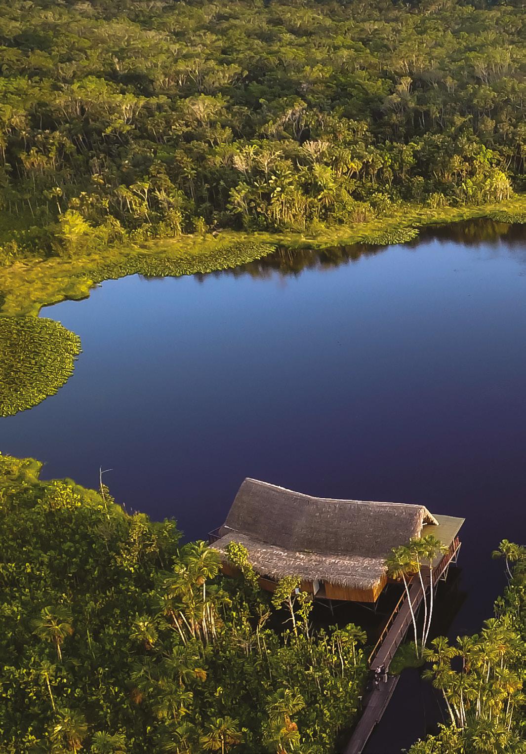 Delfin Amazon Cruises: top left, R.Rodrich top right, middle right, bottom right / Lucas Bustamante, tropicalherping. com bottom left / (p. 30) Sacha Lodge top / Spa, Inkaterra Reserva Amazonica bottom / (p. 31-32) Mount Gahinga Lodge / (p. 34 collage) Bisate Lodge, Wilderness Safaris top left / Gorillas Nest, One&Only top right, middle left, bottom right / Virunga Lodge bottom left / (p. 35 collage) Clouds