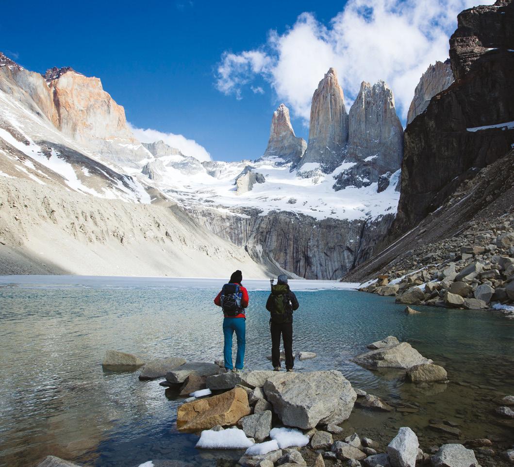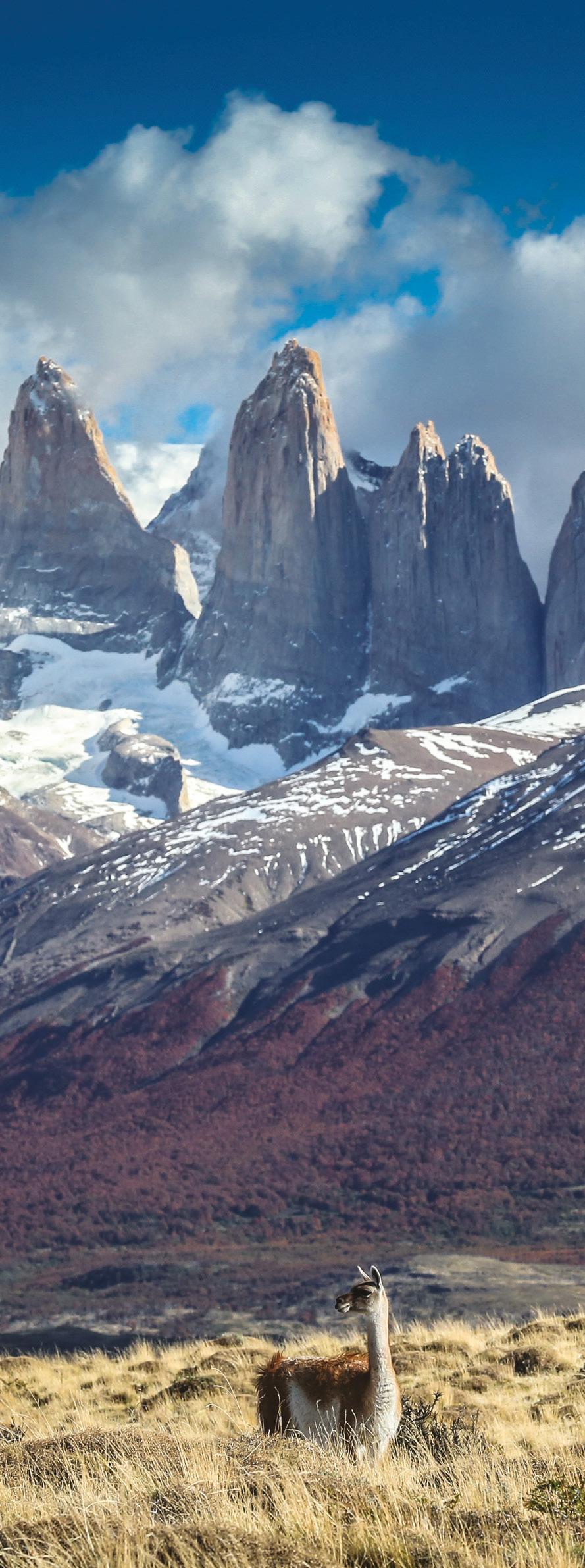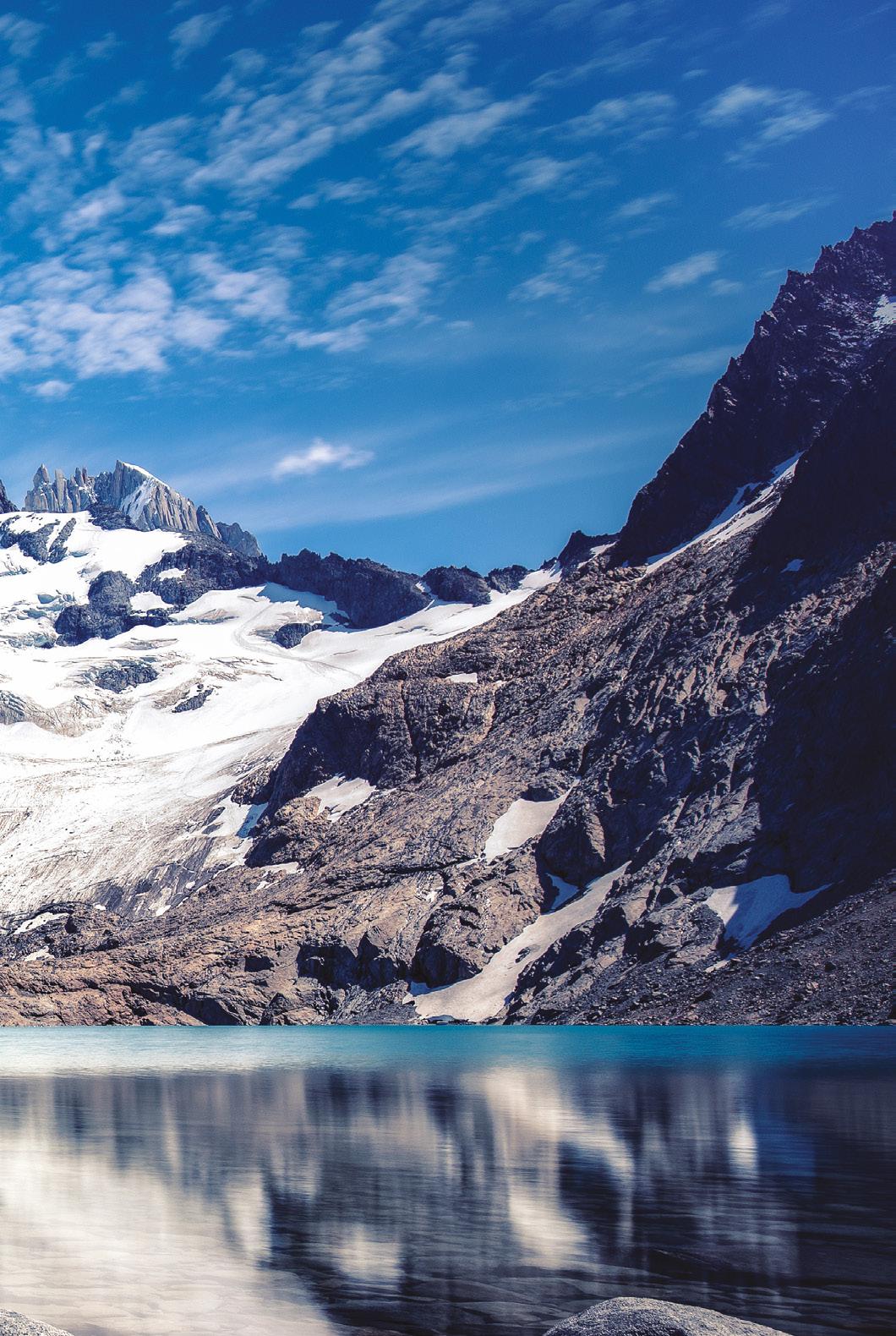If you’ve ever shopped for gear at outdoor retailer Patagonia, then you’re already familiar with Mount Fitz Roy, the toothy granite peak that inspired its logo. The journey to view Fitz Roy’s milky moraine lakes is one of the most spectacular day hikes in South America. Not only do you get a chance to view this castle-like massif up-close, you also get a highlight reel of Argentina’s famed Los Glaciares National Park. The 15.5-mile outand-back journey begins in the small resort town of El Chaltén, which is such a new village (built in the 1980s) that it didn’t even need a cemetery until 2021. A gentle climb from town leads to an overlook of the braided De Las Vueltas River, which takes you to a large meadow with Fitz Roy looming in the background. The final stretch is a demanding 1,400-foot ascent, zigzagging above the tree line to a rocky perch atop twin lagoons. Plan to stay at the newly opened Explora El Chaltén, which has the region’s best guides and views.