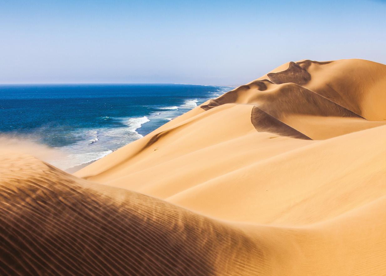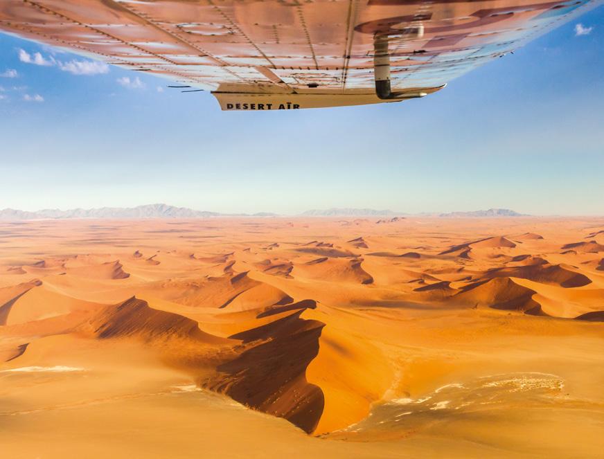 can’t see anything but sand and sky. I’m staring into an abyss of pale blue and khaki tan, but with delicate texture, similar to the fingerprint-like tracks left by an elephant walking slowly across soft earth. If I turn around in my petite Scenic Air prop plane bucket seat, however, I can just make out the sliver of emerald Atlantic Ocean bleeding into the horizon. Gazing downward, out the window, I watch the endless dunes of the Namib Desert slowly saturate with a pinkish hue as we move inland—away from the defunct diamond mines, away from the shipwrecks