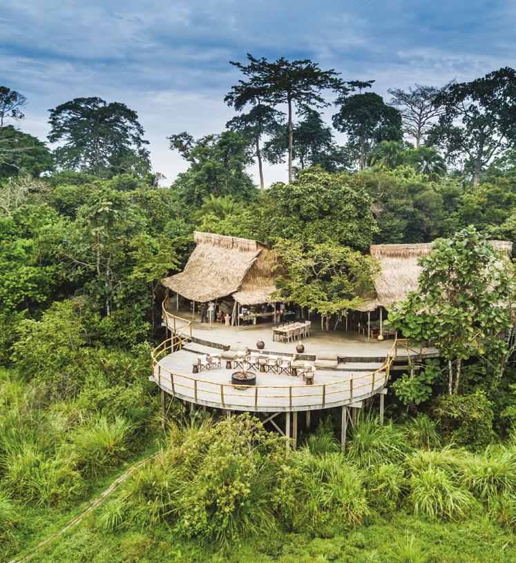 Inside the 7,413 acres of primary rainforest in the Ndzehi Concession is Ngaga camp—a true rainforest experience. The perfect home base for gorilla trekking, it’s also a focal point for primate research. The six treehouses have wraparound walkways facing directly into the forest for prime monkey and bird watching. The three habituated gorilla families in the area tend to stay close by, and have been known to visit camp.