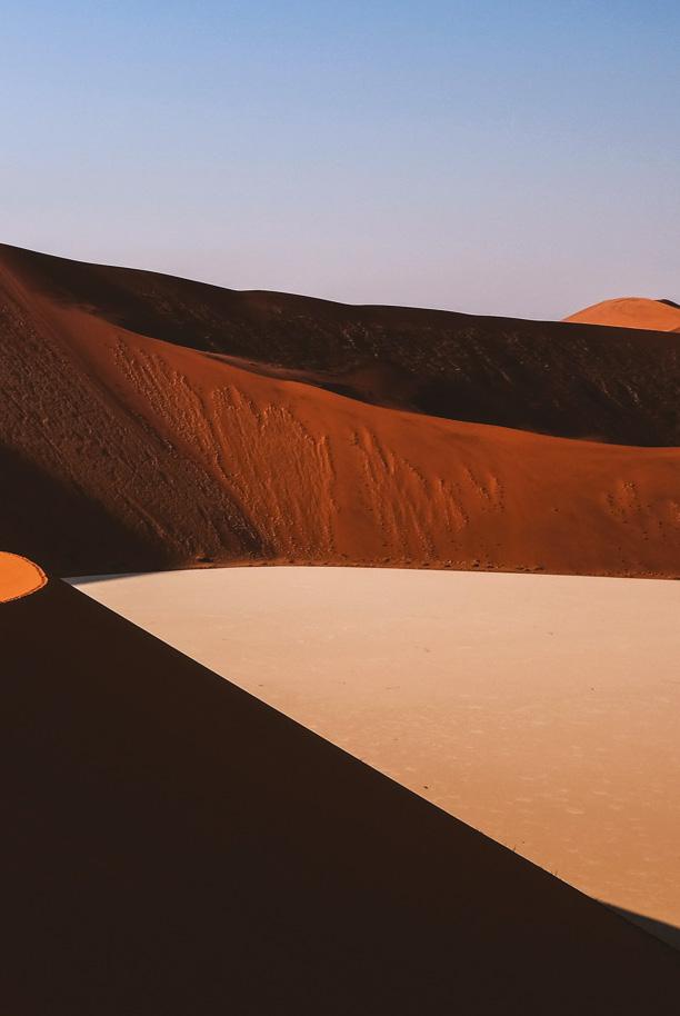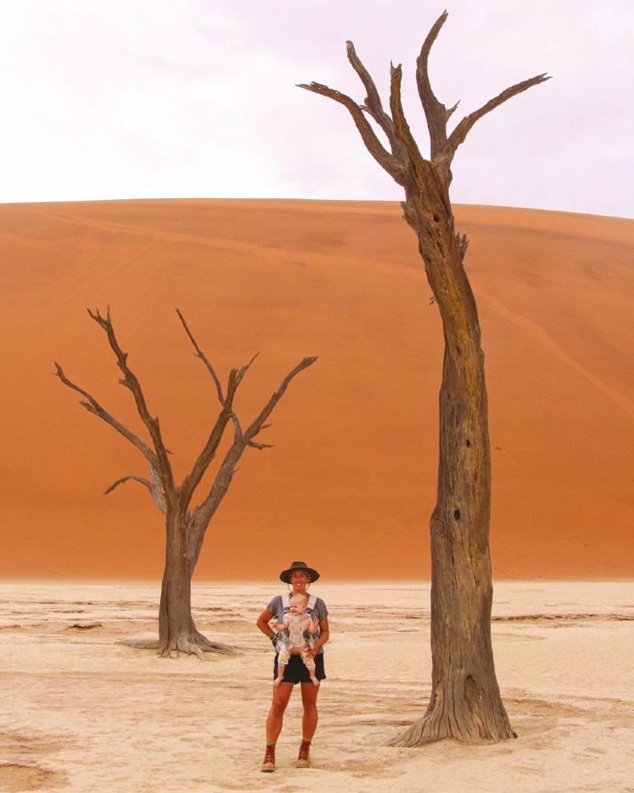 sand everywhere, fingernails to eyelashes. Our little one is covered, too, letting the brick-colored sand slide through her fingers. “Well Indah,” my husband says, “Your sandbox is arguably cooler than most kids’.” We walk across the expanse in quiet amazement—there is no one else around except ant-sized people making their own astronaut-like descents down the monumental wall of red. This, Bradley assures us, is not typical for Sossusvlei. Even more reason to revel in it.