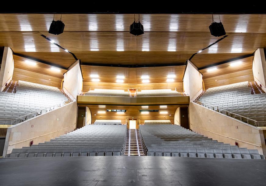 En su vibrante y colorido interior, compuesto por 9 plantas en cota, alberga 6 salas polivalentes, 2 terrazas y el Gran Auditorio con capacidad para 757 espectadores.