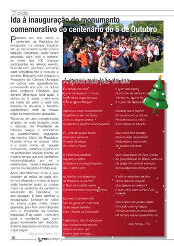 assado um ano sobre o centenário da República foi inaugurado no parque Eduardo VII, um monumento comemorativo daquele centenário, onde foram gravadas, para todo o sempre, as mãos das 100 crianças participantes no referido evento. Num dia com céu limpo, o imenso calor convidava-nos a procurar a sombra. Enquanto não chegava o Presidente da Câmara Municipal de Lisboa, nós aguardávamos, conversando uns com os outros (pais, professor Francisco, que sempre dinamizou esta ação, e alunos do S. José), o momento da caída do pano o qual nos impedia de visualizar o trabalho arquitetónico onde as nossas mãos se encontravam gravadas. Tratou-se de uma comemoração simples, de curta duração, onde o discurso do Presidente da Câmara realçou o simbolismo do acontecimento, augurando um risonho futuro da República. Quando vimos as nossas mãos e o nosso nome, ali, naquele monumento, sentimos orgulho em ter participado naquele evento, ao mesmo tempo que nos sentíamos responsabilizados por vir a desenvolver, manter e respeitar os valores da República Portuguesa.