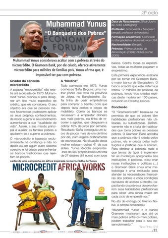 baixos. Contra todas as expetativas, todas as mulheres pagaram o empréstimo. Esta primeira experiência acabaria por se tornar no Grameen Bank, o maior banco de Bangladesh. O banco acredita que este sistema já retirou 12 milhões de pessoas da pobreza, tendo sido criadas réplicas deste modelo em 100 países, incluindo os Estados Unidos. Conclusão “O “Grameencredit” baseia-se na premissa de que os pobres têm habilidades profissionais não utilizadas, ou subutilizadas. Definitivamente não é a falta de habilidades que torna pobres as pessoas pobres. O Grameen Bank acredita que a pobreza não é criada pelos pobres, ela é criada pelas instituições e políticas que o cercam. Para eliminar a pobreza, tudo o que temos de fazer é implementar as mudanças apropriadas nas instituições e políticas, e/ou criar novas instituições e políticas (…) o Grameen Bank criou uma metodologia e uma instituição para atender às necessidades financeiras dos pobres e criou condições razoáveis de acesso a crédito, capacitando os pobres a desenvolverem suas habilidades profissionais para obter uma renda maior em cada ciclo de empréstimos.” No ato de entrega do Prémio Nobel, o comité considerou: “Muhammad Yunus e o banco Grameen mostraram que até os mais pobres entre os mais pobres, podem trabalhar para o seu desenvolvimento.” Filipa Pinto, 9ºA