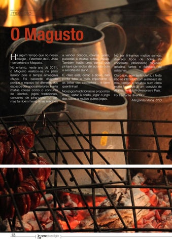 á algum tempo que no nosso colégio - Externato de S. José - se celebra o Magusto. No entanto, neste ano de 2011, o Magusto realizou-se no pátio interior pois o tempo ameaçava chuva. Foi bastante divertido porque o espaço foi diferente dos espaços dos anos anteriores. Havia muitas coisas como o concurso de talentos, jogos tradicionais, concurso de ping-pong, o bar, mas também havia umas meninas