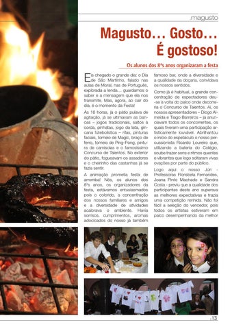 is chegado o grande dia: o Dia de São Martinho, falado nas aulas de Moral, nas de Português, explorada a lenda… guardamos o saber e a mensagem que ela nos transmite. Mas, agora, ao cair do dia, é o momento da Festa! Às 16 horas, já o pátio pulava de agitação, já se ultimavam as bancas – jogos tradicionais, saltos à corda, pinhatas, jogo da lata, gincana futebolística – rifas, pinturas faciais, torneio de Magic, braço de ferro, torneio de Ping-Pong, pintura de camisolas e o famosíssimo Concurso de Talentos. No exterior do pátio, fogueavam os assadores e o cheirinho das castanhas já se fazia sentir. A animação prometia festa de arromba! Nós, os alunos dos 8ºs anos, os organizadores da festa, estávamos entusiasmados pois o colorido, a concentração dos nossos familiares e amigos e a diversidade de atividades acalorava o ambiente. Havia sorrisos, cumprimentos, aromas adocicados do nosso já também