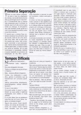 Primeira Separação T odos os pais devem preparar-se para a fase de adaptação da criança, que pode durar poucos dias ou prolongar-se por mais tempo. É fundamental que a criança seja preparada para a entrada na escola, que é um ato comum para todas as crianças. O entusiasmo dos pais também pode ajudá-la a criar uma expetativa positiva sobre a sua ida à escola. É natural que a criança fique ansiosa e receosa nos primeiros dias de escola, trata-se de uma situação nova. Mas, são os pais que, na maioria das vezes, não conseguem esconder a sua preocupação. Diante desta ansiedade transmitida pelos pais, a criança acaba por sentir-se perdida. Se os pais controlarem a ansiedade, estarão a ajudar bastante no processo de adaptação do seu filho; quanto
