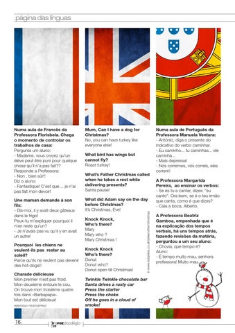 Numa aula de Português da Professora Manuela Ventura: - António, diga o presente do indicativo do verbo caminhar. - Eu caminho... tu caminhas... ele caminha... - Mais depressa! - Nós corremos, vós correis, eles correm! A Professora Margarida Pereira, ao ensinar os verbos: - Se és tu a cantar, dizes: “eu canto”. Ora bem, se é o teu irmão que canta, como é que dizes? - Cala a boca, Alberto. A Professora Beatriz Gamboa, empenhada que é na explicação dos tempos verbais, há uns tempos atrás, fazendo revisões da matéria, perguntou a um seu aluno: - Chovia, que tempo é? Aluno: - É tempo muito mau, senhora professora! Muito mau…