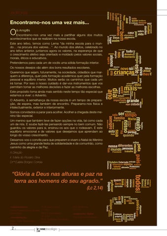 Encontramo-nos uma vez mais a partilhar alguns dos muitos acontecimentos que se realizam na nossa escola. Este ano letivo, temos como Lema “da minha escola para o mundo… na procura dos valores…”. Ao mundo dos afetos, celebrado no ano letivo anterior, juntamos agora os valores, na esperança de que o crescimento afetivo seja orientado e moldado pelos valores sociais, morais, éticos e educativos. Pretendemos para cada um de vocês uma sólida formação interior. Os nossos desejos vão além dos bons resultados escolares. Queremos que sejam, futuramente, na sociedade, cidadãos que marquem a diferença, quer pela formação académica quer pela formação pessoal e equilíbrio interior. Muitos serão os caminhos que cada um irá tomar. Por isso o nosso cuidado é dar-vos instrumentos que vos permitam tomar as melhores decisões e fazer as melhores escolhas. Este propósito toma ainda mais sentido neste tempo tão especial que estamos a viver: o Advento. O Advento, à semelhança da nossa escola é um tempo de preparação, de espera, mas também de encontro. Preparamo-nos física e intelectualmente, exterior e interiormente. Somos convidados a parar para acolher. Acolher a chegada deste menino tão especial. Um menino que também teve de fazer opções na vida, tal como cada um de nós. E soube fazê-las pensando sempre no bem comum. Não guardou os valores para si, ensinou-os aos que o rodeavam. É este equilíbrio emocional e de valores que desejamos que aprendam ao longo do vosso crescimento. Deixamos-vos o convite para que preparem e vivam o Natal do Menino Jesus como uma grande festa de solidariedade e de comunhão, como caminho da alegria e da Paz. A Direção Ir. Maria do Rosário Silva Dr.ª Eulária Borges Correia