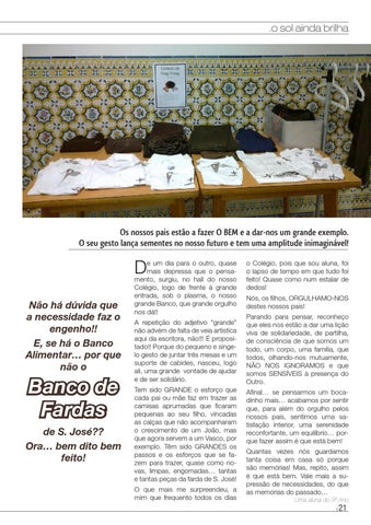 o Colégio, pois que sou aluna, foi o lapso de tempo em que tudo foi feito! Quase como num estalar de dedos! Nós, os filhos, ORGULHAMO-NOS destes nossos pais! Parando para pensar, reconheço que eles nos estão a dar uma lição viva de solidariedade, de partilha, de consciência de que somos um todo, um corpo, uma família, que todos, olhando-nos mutuamente, NÃO NOS IGNORAMOS e que somos SENSÍVEIS à presença do Outro. Afinal… se pensarmos um bocadinho mais… acabamos por sentir que, para além do orgulho pelos nossos pais, sentimos uma satisfação interior, uma serenidade reconfortante, um equilíbrio… porque fazer assim é que está bem! Quantas vezes nós guardamos tanta coisa em casa só porque são memórias! Mas, repito, assim é que está bem. Vale mais a supressão de necessidades, do que as memórias do passado… Uma aluna do 9º Ano