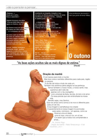 Oração da manhã O sol nasceu para todo o mundo Mas teve cores e sentidos diferentes para cada país, região ou pessoa. Tu és tão de todos e todo de cada um. Também nós sentimos plena alegria na tua pertença. Temos também o nosso modo, o nosso sentir, mas queremos abrir este dia apenas com o teu evangelho: Livro universal da festa, da luta, do luto e do amor. Foi essa prenda que veio embrulhada na nossa vida. Bendito sejas, meu Senhor, Que nos amas como somos e és novo e diferente para cada um de nós. À tua imagem e semelhança nos criaste E pacientemente à nossa imagem te acomodas para seres, connosco, um apenas, como se fôramos uma só idade, uma só raça, uma só cor, um só ser. E é assim que a todos nos compreendes e amas... Pe. António Rego Oração da manhã – Rádio Renascença – 8 de Novembro, 2011