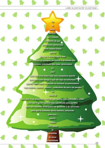Eu te peço Senhor: que o mundo se enfeite de paz que árvores generosas deem muitos frutos que só de trigo e milho e pão e mel se encham os campos, as searas e as mesas dos homens, sobretudo dos mais carenciados eu rezo para que neste Natal haja uma manjedora quente para cada sem-abrigo e que ele seja reconfortado que em cada canto do mundo os homens se presenteiem com muitos…muitos, muitos… embrulhos de paz e de perdão eu louvo-te para que a tua presença, mais do que nunca, seja concórdia e união para que o gesto egoísta seja substituído pela partilha para que sejamos despojados de ganância e de obcessão para que te sintamos divino menino, renascido ...para nós… para ti e para mim numa fé revestida de amor e humildade
