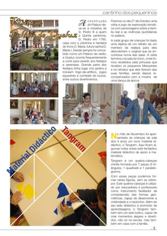 o mês de Novembro foi apresentado às crianças da sala dos 4 anos um novo material didáctico, o Tangram. Aqui ficam algumas notas sobre este fantástico material didáctico de apoio à matemática. Tangram é um quebra-cabeças chinês formado por 7 peças (5 triângulos, 1 quadrado e 1 paralelogramo). Com essas peças podemos formar várias figuras, sem as sobrepor. Este quebra-cabeças é utilizado por educadores e professores como instrumento facilitador da compreensão das formas geométricas, capaz de desenvolver a criatividade e o raciocínio. Além do seu lado didáctico e promotor de aprendizagens, o Tangram também tem um lado lúdico, capaz de criar momentos alegres e divertidos, não só na escola, mas também em casa com a família.