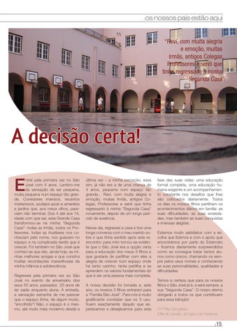 última vez – a minha perceção, essa sim, já não era a de uma criança de 4 anos, pequena num espaço tão grande... Revi, com muita alegria e emoção, muitas Irmãs, antigos Colegas, Professores e senti que tinha regressado à minha “Segunda Casa” novamente, depois de um longo período de ausência. Nesse dia, regressei a casa e tive uma longa conversa com o meu marido sobre o que tinha sentido após este reencontro: para mim tornou-se evidente que o São José era a opção certa para a educação dos meus 3 filhos e que gostaria de partilhar com eles a alegria de crescer num espaço onde há tanto carinho, tanta partilha e se aprendem os valores fundamentais do que é ser uma pessoa mais completa. A nossa decisão foi tomada e, este ano, os nossos 3 filhos entraram para a “Família São José”. Para nós é muito gratificante constatar que os 3 usufruem exactamente daquilo que esperávamos e desejávamos para esta