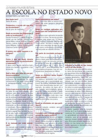 Havia brincadeiras nas aulas? Não... Era muito difícil os alunos brincarem nas aulas porque a disciplina era muito rígida. Quais os castigos aplicados aos alunos que não cumprissem as regras? Os castigos eram aplicados na escola primária e no liceu. Na escola primária o castigo mais severo era “A Palmatória”, também chamada “Menina-de-cinco-olhos”. No liceu o castigo mais severo era a expulsão da sala de aula e se o aluno continuasse a comportar-se mal podia ser expulso do liceu. Fez parte da mocidade portuguesa? Claro! Todos os estudantes eram obrigados a fazer parte da mocidade portuguesa a partir da instrução primária até ao fim do liceu se completasse o liceu com menos de 17 anos. Com mais do que 17 anos frequentava, não a mocidade portuguesa, mas sim, outra estrutura designada por Milícia. Quais os objetivos dessa organização juvenil? Os objetivos declarados pelo poder político eram dar a oportunidade aos jovens de praticar atividades desportivas muito diversificadas que iam, por exemplo, da prática de jogos até à vela, natação, aeromodelismo, canoagem, etc. Havia naturalmente, e dado o tipo de regime político existente em Portugal, um objetivo muito claro, mas não explicito, de mentalização e enquadramento militar dos jovens. Quais as atividades em que participou? Esgrima, natação, andebol, aeromodelismo e ginástica. Considera que a escola estava ao serviço do regime político? Absolutamente! Ao serviço do regime político e a ele completamente subordinado. Basta recordar as verbas disponibilizadas pelo governo de então, para fazer face a todas as atividades da mocidade portuguesa. O facto dos manuais escolares serem livros únicos, os seus conteúdos seguiam fielmente a filosofia do regime.