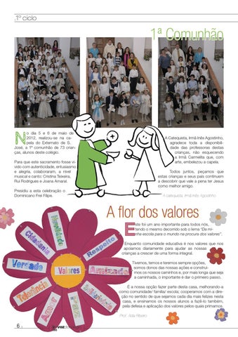Enquanto comunidade educativa é nos valores que nos apoiamos diariamente para ajudar as nossas crianças a crescer de uma forma integral. Tivemos, temos e teremos sempre opções, somos donos das nossas ações e construímos os nossos caminhos e, por mais longa que seja a caminhada, o importante é dar o primeiro passo. É a nossa opção fazer parte desta casa, melhorando-a como comunidade/ família/ escola; cooperamos com a direção no sentido de que sejamos cada dia mais felizes nesta casa, e ensinamos os nossos alunos a fazê-lo também, pela defesa e aplicação dos valores pelos quais primamos. Prof. Alda Ribeiro