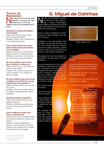 os dias 23, 24 e 26 de abril, decorreu o torneio de badminton do 2º e 3º ciclo. Falámos com os vencedores do 2º ciclo. Gostaram do torneio de badminton? Porquê? Helena: Sim, gostei muito porque gosto de jogar badminton. Frederico: Adorei, pois o badminton é o meu desporto favorito. Como é que acham que correu este primeiro torneio de badminton no colégio? Helena: Correu bem, embora talvez estivesse um pouco desorganizado Frederico: Correu bem, mas se tivesse mais campos, teria sido melhor. Na vossa opinião, este torneio deve continuar a realizar-se? Helena: Claro que sim, pois tenho de manter o meu título!! Frederico: Sim, porque foi muito divertido e ajudou-nos a melhorar a técnica de jogo. Em que medida é que este torneio contribuiu para melhorar a vossa experiência como jogadores? Helena: Percebi melhor como se joga em torneio. Frederico: Fiquei a conhecer melhor os defeitos e qualidades dos outros jogadores. Estavam à espera de ganhar? Helena: Não, porque não sou uma jogadora assídua. Frederico: Não estava à espera, porque nem sequer era para entrar no torneio. Como reagiram ao saber que eram os vencedores? Helena: Fiquei muito contente porque não estava à espera e é sempre bom ganhar. Frederico: Fiquei surpreendido a pensar no que me tinha acontecido e fiquei muito contente com a reação entusiasta dos meus colegas. Professora Carla Cabaço Frederico Lousada, 6ºC Helena Teixeira, 6ºC