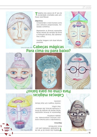 Cabeças mágicas Para cima ou para baixo? Inventar imagens com duas leituras possíveis. Representar as diversas expressões faciais através da variação da forma e inclinação da boca, das sobrancelhas e olhos; Compreender o rosto humano como uma estrutura proporcionada, modulada e simétrica; Objectivos