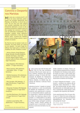 Adorámos termos “viajado no tempo” pois assistimos a uma reconstituição da Batalha de Aljubarrota, in loco, e pudemos, até, experienciar e manusear os instrumentos bélicos usados pelos aguerridos e valentes portugueses Como apontamento final, há que refede então. Era imperioso salvar a interir que o S. Pedro foi nosso amigo pois gridade e a independência da Pátria; que nos permitiu almoçar num parque éramos poucos, contra os castelhanos agradabilíssimo de merendas, sem que tinham larga vantagem numérica uma pinga de chuva!! e bélica. Porém, tirando partido da Rita Torres, Xavier Resende e orografia local e recorrendo a táticas Tiago Costa, 8º B diversas, numa hora tornámo-nos vencedores. !poderá saber mais sobre esta notícia na pág 18!