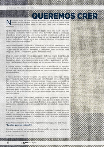 Apetece-nos, mas mesmo que isto fosse uma opção, nunca seria linear. Será possível escolher o isolamento na tranquilidade idílica do “ninho”, intacto na identidade original que preserva aspetos positivos, mas também cristaliza os negativos, sem nos sentirmos insatisfeitos? Ou, ao invés, lançarmo-nos na inquietude da abertura a novos horizontes e culturas, ser-se atual e atuante, integrado e interligado, sem, quiçá, nos sentirmos angustiados? Será possível fugir desta era global da Informação? Tal já não nos parece sequer uma opção. Apenas uma tentação e, mesmo assim, polémica. Atrevemo-nos a equacioná-la, pelo cansaço de “assistir” impotentes, a tanta guerra, tanto cataclismo, tanta desgraça e miséria… Tanto horror, que faz de nós descrentes. Claro que surgem também notícias boas, registos de beleza singela, de candura, de bravura, de respeito pelo mundo e por todos os seres vivos, gestos nobres e altruístas, que nos lavam a alma e nos renovam a fé nas melhores qualidades do bicho homem. Mas, talvez por não serem chocantes, não nos marquem tanto, como deveriam. A título de exemplo, recordamos o caso, que foi notícia televisiva, de um sem abrigo - que nome tinha? Ele que nos perdoe, mas chamemos-lhe Francisco, por lhe assentar bem – e do seu cão - pensamos que era Tom - companheiros inseparáveis, até no infortúnio. A história é simples: Francisco veio parar à rua porque perdeu o emprego e deixou de poder pagar a casa. De um momento para o outro ficou sem abrigo, conservando Tom como único “bem” pessoal. Entrou num círculo vicioso, porque, sem residência fixa, tornou-se impossível encontrar emprego e, sem emprego, era impraticável arranjar casa. Pelo caminho surgiram algumas ofertas de alojamento, que Francisco declinou por não incluírem Tom. Nunca poderia abandoná-lo – “Nós somos responsáveis por aquilo que cativamos”. E, assim juntos, foram sobrevivendo por longo tempo na rua, até ao dia em que a reportagem televisiva lhes abriu novas portas para uma vida melhor… Em suma, uma história com final feliz, entre tantas outras igualmente belas, mesmo que sem final à vista… Como a daqueles dois casais, de sítios e idades diferentes, mas em idêntica situação de precariedade financeira e que, apesar disso, mantêm estoicamente a seu cargo vários animais abandonados e maltratados pelos antigos donos. É na adversidade que se conhecem as verdadeiras qualidades individuais e cremos que, mais do que o uso da palavra e desenvolvimento intelectual, o que verdadeiramente nos distingue de todos os outros animais é esta capacidade de superar os instintos primários de sobrevivência, dando ênfase às virtudes e aos valores em que acreditamos. Queremos crer. Neste Ano Internacional da Fé, vem a propósito recordar as palavras de S. Paulo: “Eu sei em quem pus a minha fé”. Quanto a nós, que não somos santos nem fomos ungidos por tal dom, gostaríamos apenas de poder continuar a acreditar no Homem. Isabel Pires de Carvalho