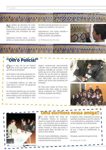dagem, esclarecendo, descontraindo e pondo mais à vontade toda aquela pequena multidão de curiosos. A tal ponto que já os olhos não bastavam: tiveram de ver de perto as algemas, carteiras profissionais e até estiveram num “tête-à-tête” com um Polícia Sinaleiro, dos únicos dois existentes em Portugal! No final, para validar de forma inesquecível esta visita, todos os nossos alunos receberam um “Cartão Profissional de Ajudante de Polícia”. As Professoras dos 2ºs anos