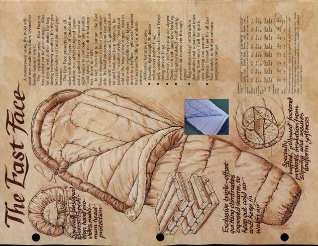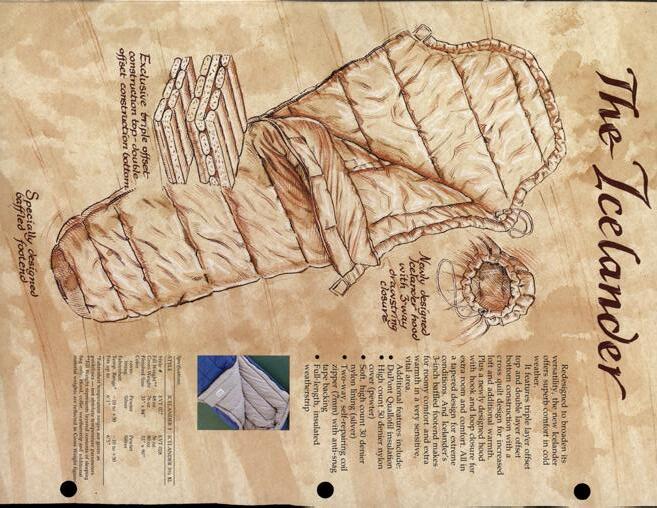 The Everest Elite line was expanded into numerous collections to suit the needs of different kinds of campers, and innovations continued. The new Featherweight Series exclusively used goose down fill, for backpackers who wanted maximum bag compressibility. The Expedition Series was positioned for those who truly risked their lives in their adventures. They also offered the Take-ItOr-Leave-It – a true four-season bag with a colorcoded, zip-on layering system. And the SlumberTech Series introduced both 3M’s Thinsulate Lite Loft and Dupont’s Micro-Loft insulation, and featured the new “hot hood” to reduce heat loss in the critical head area.