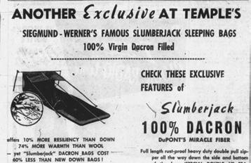 Salt Lake Tribune newspaper clipping from 1953 advertising Dacron’s Slumberjack sleeping bags.