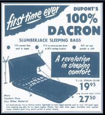 outdoor lifestyle magazines like Field and Stream and Backpacker. These advertisements sold the concept of synthetic materials, but not the actual product. Consumers could learn about the materials and then shop in a brick and mortar store or a catalog for products that contained it. Manufacturers in turn were inspired by the unparalleled warmth and comfort of the fiberfill, and before long “Slumberjack Sleeping Bags” were being produced across the country.