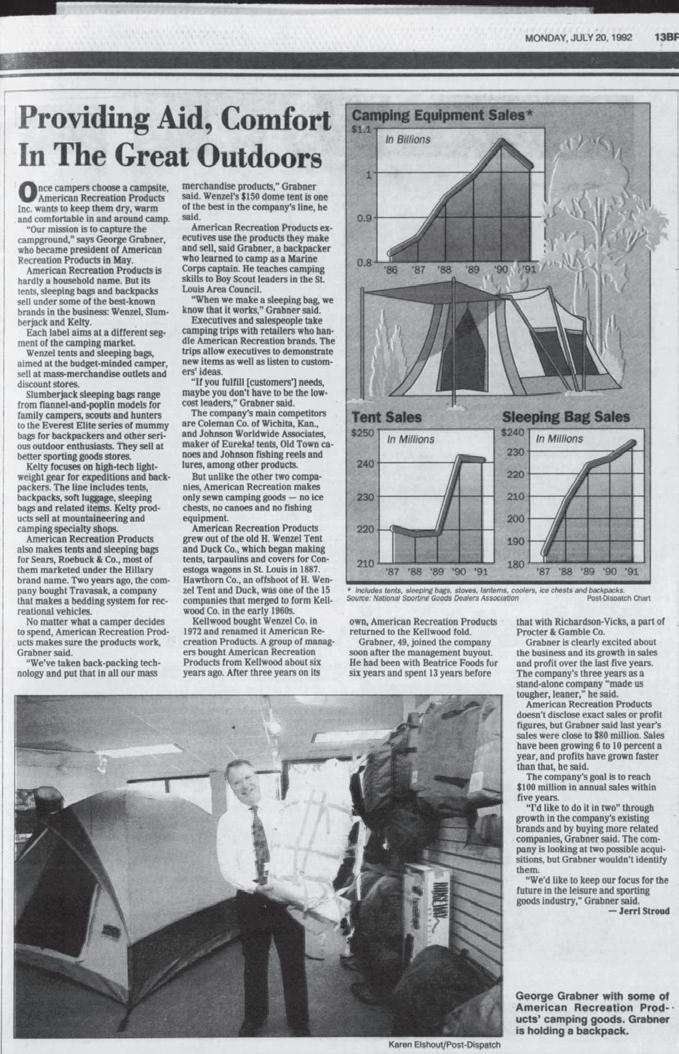 Meanwhile over in St. Louis, MO, the executive team of another camping company, American Recreational Products (ARP) had its eye on Slumberjack. ARP’s Executive Vice President, George Grabner, knew the camping market like nobody else. An avid outdoorsman, Grabner’s accomplishments include