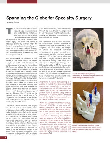 he first encounter with Gadi Ronen was with a 3D translucent model of his skull and tumor. He followed soon after to meet his surgeons, Carl Snyderman and Paul Gardner, Co-Directors of the UPMC Center for Skull Base Surgery. The model was created by Stratasys, a company in Israel where Mr. Ronen is employed as an industrial engineer. Once the model was completed, Stratasys sent an employee to Pittsburgh with the 3-D skull to ensure that Dr. Snyderman received the final product intact. Gadi Ronen tackled his battle with a sinus cancer in the same fashion he handles everything in his life – with intense research and the support of family and friends. When Mr. Ronen was advised that his cancer had reoccurred and that surgery was his remaining option, his physician recommended the best surgeon to perform this intricate surgery, Dr. Carl Snyderman and the Center for Skull Base Surgery in the Department of Otolaryngology at the University of Pittsburgh. Mr. Ronen then consulted with a friend, an ordained rabbi, who operates an ambulance company in his home country of Israel and ‘matches sick people with the best hospitals and doctors in the world’ [https://en.wikipedia.org/wiki/ Avraham_Elimelech_Firer]. “He told me that the only person that I should see is Carl Snyderman, MD. I scheduled an appointment with Dr. Snyderman and left immediately for Pittsburgh,” states Mr. Ronen. The UPMC Center for Skull Base Surgery was the first such center in North America and pioneered many of the techniques used today, including minimally invasive surgical procedures for the removal of sinus cancers and brain tumors. Depending on the location of the tumor, Dr. Snyderman and his colleagues can surgically remove it through the nose, avoiding extensive facial incisions and opening of the skull. In Mr. Ronen’s case, the tumor was behind his nose, but close to the eye and major vessels to the brain. During the ten-hour surgery at UPMC in October, Dr. Snyderman and Dr. Gardner