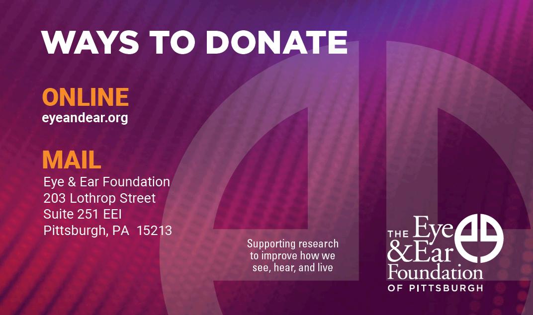The Eye & Ear Foundation of Pittsburgh, an independent 501(c)(3) organization, was founded in 1985 to foster philanthropic support for the Departments of Ophthalmology and Otolaryngology-Head & Neck Surgery at the University of Pittsburgh. The goal is to keep moving forward, expanding EEF’s support network, and helping the Departments achieve unparalleled distinction in research, education, outreach, and patient care.