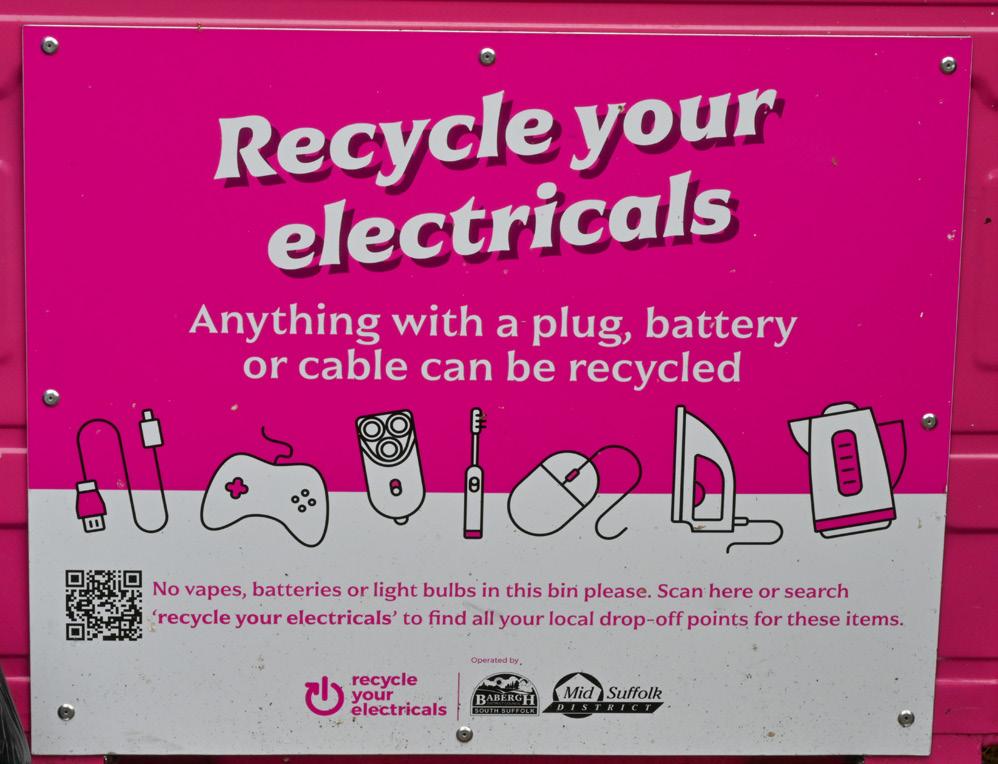 The bin is part of Babergh and Mid Suffolk District Council’s new scheme to make it easier to recycle broken electrical items. This includes things like broken coffee machines, kettles, mobile phones, tablets - anything smaller than a 4-slice toaster.