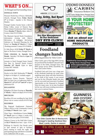 BRUCKLESS Bruckless NS now enrolling for Sept 2018. Please visit or contact school; 074 9737366 KILLYBEGS The Regional Employment Outreach Officer will be in the Community Centre on Friday 2nd March 11am - 1pm. Chair Yoga + Mindfulness Course Friday 2nd March 2pm to 3.30pm; 4 weeks €10; ring to book your place; 074 9741863. Safepass Course in the Niall Mór Centre on Sat 3rd March from 8am – 5pm - €110 Killybegs St. Patrick’s Day Parade starts at 2pm instead of 3pm to facilitate those wanting to watch the rugby. All participating groups and floats to assemble at St. Catherine’s VEC at 1pm.