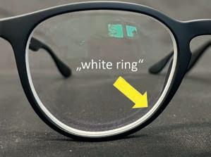 While the lens is responsible for “vision”, the “appearance” is determined by the frame. However, there is another factor that has a major impact on the appearance and effect of the glasses: the edge of the lens. Figure 2 shows two optical phenomena that are always present and have a detrimental effect on the overall impression of the spectacles and the spectacle wearer, due to reflections at the edge of the lens. The power of the lens leads to myopic rings in short-sighted people, which are more or less visible to the observer depending on the lens power, frame size and viewing angle. While myopic rings can only be seen at a flat viewing angle at lower diopters (see Fig. 2 on the left), at higher diopters, the rings are also visible from the front and can have a significant impact on the aesthetic appearance. We would also like to address the second effect here, namely the white reflections between the frame and lens – known as “white rings” – which can also occur with plus lenses. Caused by the diffuse reflective surface of the edge of the lens, they show up more or less strongly depending on