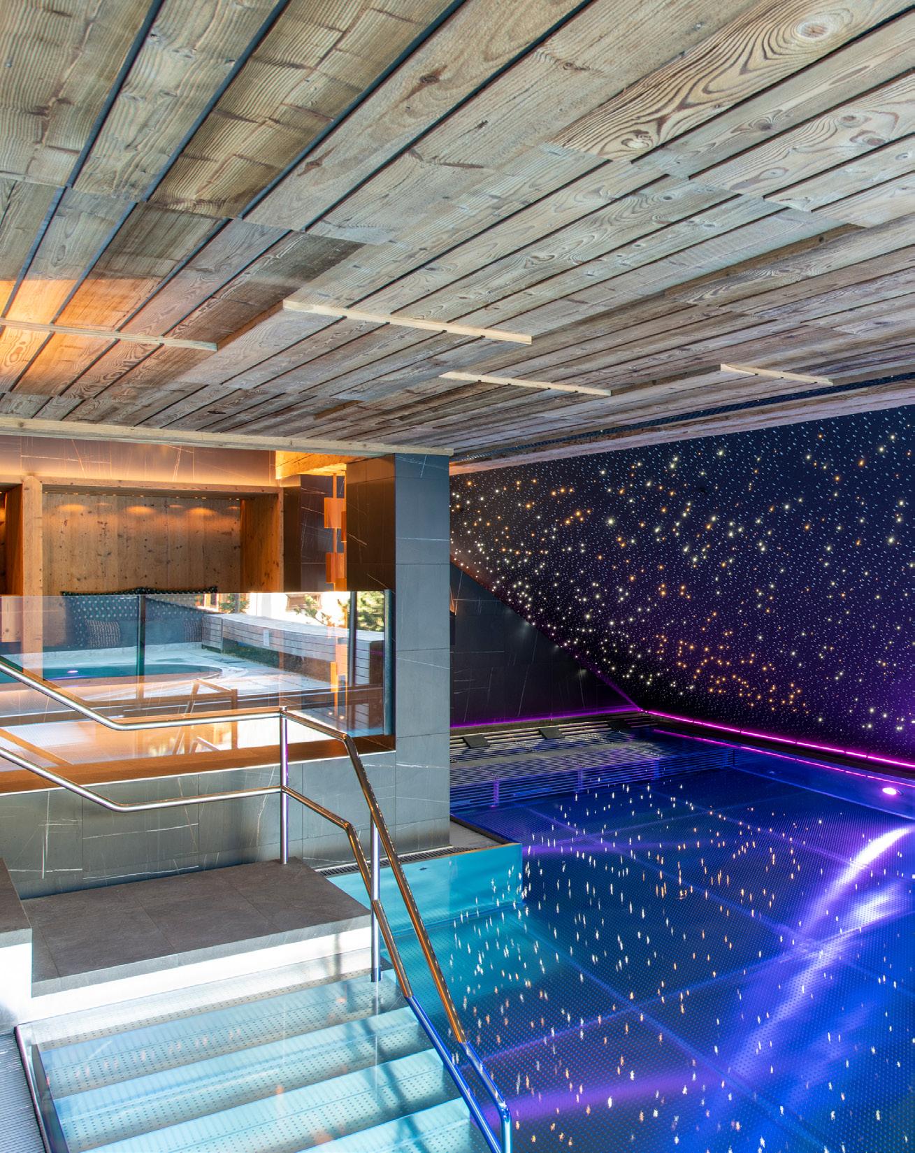 Yet it is inside that the true escape reaches its peak. The 1,300-square-meter spa is a cocoon of softness and warmth. Pools bathed in natural light and open to the alpine panorama offer an exceptional sensory experience. Steam rooms release a soothing vapor, perfect for releasing built-up tension, while Himalayan sea salt saunas rich in healing properties invite deep purification in a silence ideal for meditation. At the heart of this haven of peace, the signature treatments developed in close collaboration with the renowned brands Esse and Dr Burgener unfold like true rituals, blending delicate textures with subtle scents.